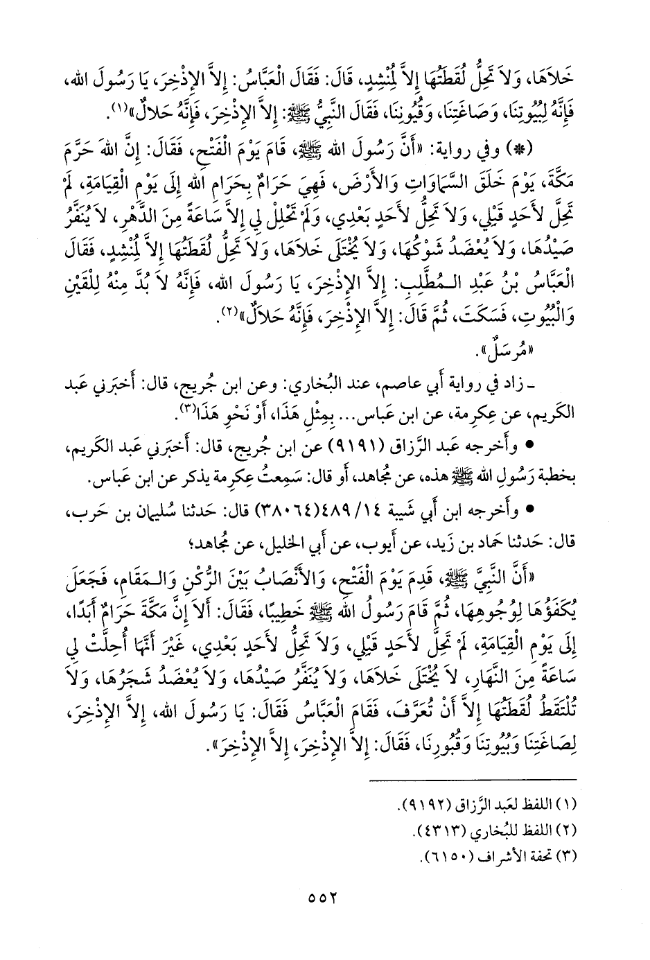 - وفي رواية: «أن رسول الله صَلى الله عَليه وسَلم قام يوم الفتح، فقال: إن الله حرم مكة، يوم خلق السماوات والأرض، فهي حرام بحرام الله إلى يوم القيامة، لم تحل لأحد قبلي، ولا تحل لأحد بعدي، ولم تحلل لي إلا ساعة من الدهر، لا ينفر صيدها، ولا يعضد شوكها، ولا يختلى خلاها، ولا تحل لقطتها إلا لمنشد، فقال العباس بن عبد المطلب: إلا الإذخر، يا رسول الله، فإنه لا بد منه للقين والبيوت، فسكت، ثم قال: إلا الإذخر، فإنه حلال» (¬١).