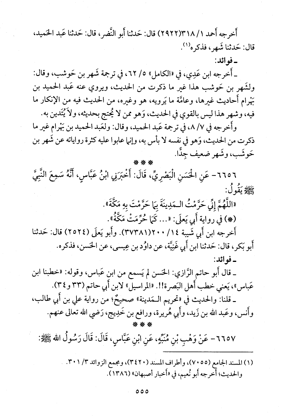وأخرجه في ٧/ ٨، في مناكير عبد الحميد، وقال: ولعبد الحميد بن بَهرام غير ما ذكرت من الحديث، وهو في نفسه لا بأس به، وإنما عابوا عليه كثرة رواياته عن شهر بن حوشب، وشهر ضعيف جدا.