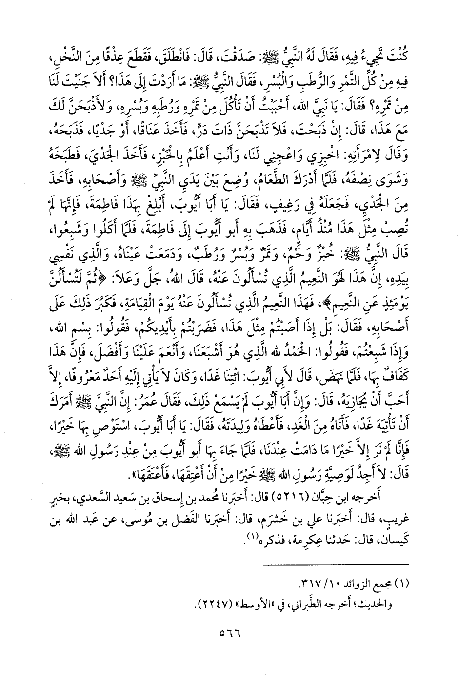 فقال: يا أبا أيوب، أبلغ بهذا فاطمة، فإنها لم تصب مثل هذا منذ أيام، فذهب به أَبو أيوب إلى فاطمة، فلما أكلوا وشبعوا، قال النبي صَلى الله عَليه وسَلم: خبز ولحم، وتمر وبسر ورطب، ودمعت عيناه، والذي نفسي بيده، إن هذا لهو النعيم الذي تسألون عنه، قال الله، جل وعلا: {ثم لتسألن يومئذ عن النعيم}، فهذا النعيم الذي تسألون عنه يوم القيامة، فكبر ذلك على أصحابه، فقال: بل إذا أصبتم مثل هذا، فضربتم بأيديكم، فقولوا: بسم الله، وإذا شبعتم، فقولوا: الحمد لله الذي هو أشبعنا، وأنعم علينا وأفضل، فإن هذا كفاف بها، فلما نهض، قال لأَبي أَيوب: ائتنا غدا، وكان لا يأتي إليه أحد معروفا، إلا أحب أن يجازيه، قال: وإن أبا أيوب لم يسمع ذلك، فقال عمر: إن النبي صَلى الله عَليه وسَلم أمرك أن تأتيه غدا، فأتاه من الغد، فأعطاه وليدته، فقال: يا أبا أيوب، استوص بها خيرا، فإنا لم نر إلا خيرًا ما دامت عندنا، فلما جاء بها أَبو أيوب من عند رسول الله صَلى الله عَليه وسَلم قال: لا أجد لوصية رسول الله صَلى الله عَليه وسَلم خيرًا من أن أعتقها، فأعتقها».
