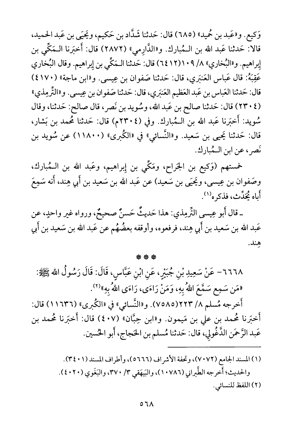 و «ابن ماجة» (٤١٧٠) قال: حدثنا العباس بن عبد العظيم العنبري، قال: حدثنا صفوان بن عيسى. و «التِّرمِذي» (٢٣٠٤) قال: حدثنا صالح بن عبد الله، وسويد بن نصر، قال صالح: حدثنا، وقال سويد: أخبرنا عبد الله بن المبارك. وفي (٢٣٠٤ م) قال: حدثنا محمد بن بشار، قال: حدثنا يحيى بن سعيد. و «النَّسَائي» في «الكبرى» (١١٨٠٠) عن سويد بن نصر، عن ابن المبارك.