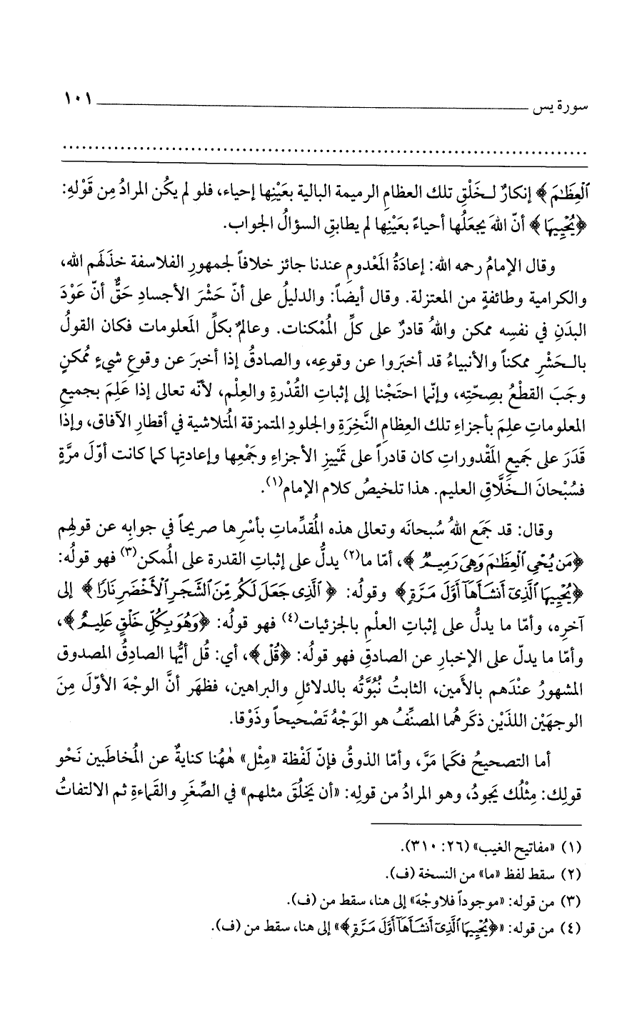 وقال الإمام رحمه الله: إعادة المعدوم عندنا جائز خلافًا لجهور الفلاسفة خذلهم الله، الكرامية وطائفة من المعتزلة. وقال أيضًا: والدليل على أن حشر الأجساد حق أن عود البدن في نفسه ممكن والله قادر على كل الممكنات. وعالم بكل المعلومات فكان القول بالحشر ممكنًا والأنبياء قد أخبروا عن وقوعه، والصادق إذا أخبر عن وقوع شيء ممكن وجب القطع بصحته، وإنما احتجنا إلى إثبات القدرة والعلم، لأنه تعالى إذا علم بجميع المعلومات علم بأجزاء تلك العظام النخرة والجلود المتمزقة المتلاشية في أقطار الآفاق، وإذا قدر على جميع المقدورات كان قادرًا على تمييز الأجزاء وجمعها وإعادتها كما كانت أول مرة فسبحان الخلاق العليم. هذا تلخيص كلام الإمام.