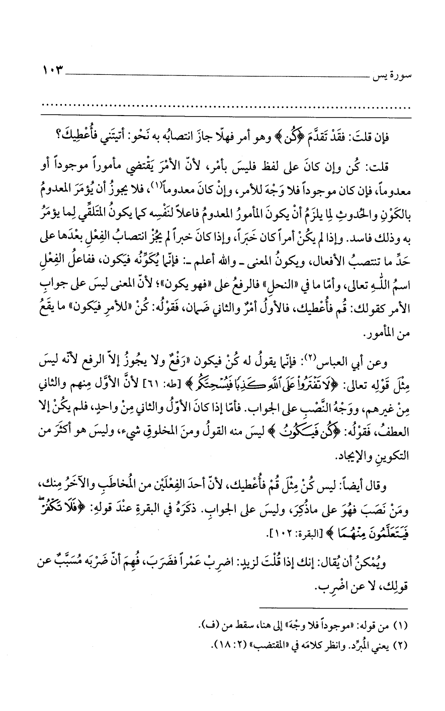 قلت: كن وإن كان على لفظ فليس بأمر، لأن الأمر يقتضي مأمورًا موجودًا أو معدومًا، فإن كان موجودًا فلا وجه للأمر، وإن كان معدومًا، فلا يجوز أن يؤمر المعدوم بالكون والحدوث لما يلزم أن يكون المأمور المعدوم فاعلًا لنفسه كما يكون المتلقي لما يؤمر به وذلك فاسد. وإذا لم يكن أمرًا كان خبرًا، وإذا كان خبرًا لم يجز انتصاب الفعل بعدها على حد ما تنتصب الأفعال، ويكون المعنى- والله أعلم-: فإنما يكونه فيكون، ففاعل الفعل اسم الله تعالى، وأما ما في "النحل" فالرفع على "فهو يكون"؛ لأن المعنى ليس على جواب الأمر كقولك: قم فأعطيك، فالأول أمر والثاني ضمان، فقوله: كن "للأمر فيكون" ما يقع من المأمور.