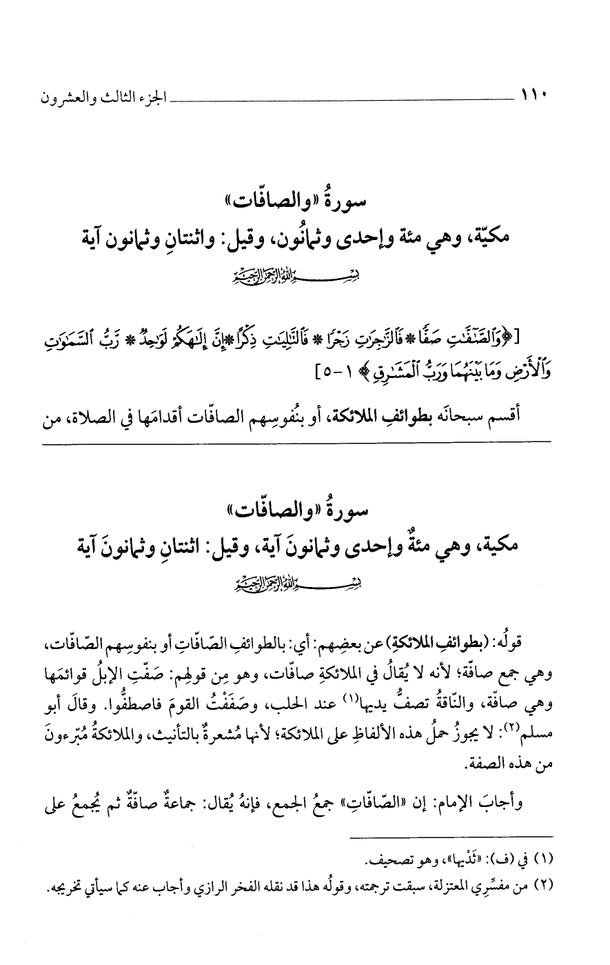 قوله: (بطوائف الملائكة) عن بعضهم: أي: بالطوائف الصافات أو بنفوسهم الصافات، وهي جمع صافة؛ لأنه لا يقال في الملائكة صافات، وهو من قولهم: صفت الإبل قوائمها وهي صافة، والناقة تصف يديها عند الحلب، وصففت القوم فاصطفوا. وقال أبو مسلم: لا يجوز حمل هذه الألفاظ على الملائكة؛ لأنها مشعرة بالتأنيث، والملائكة مبرءون من هذه الصفة.