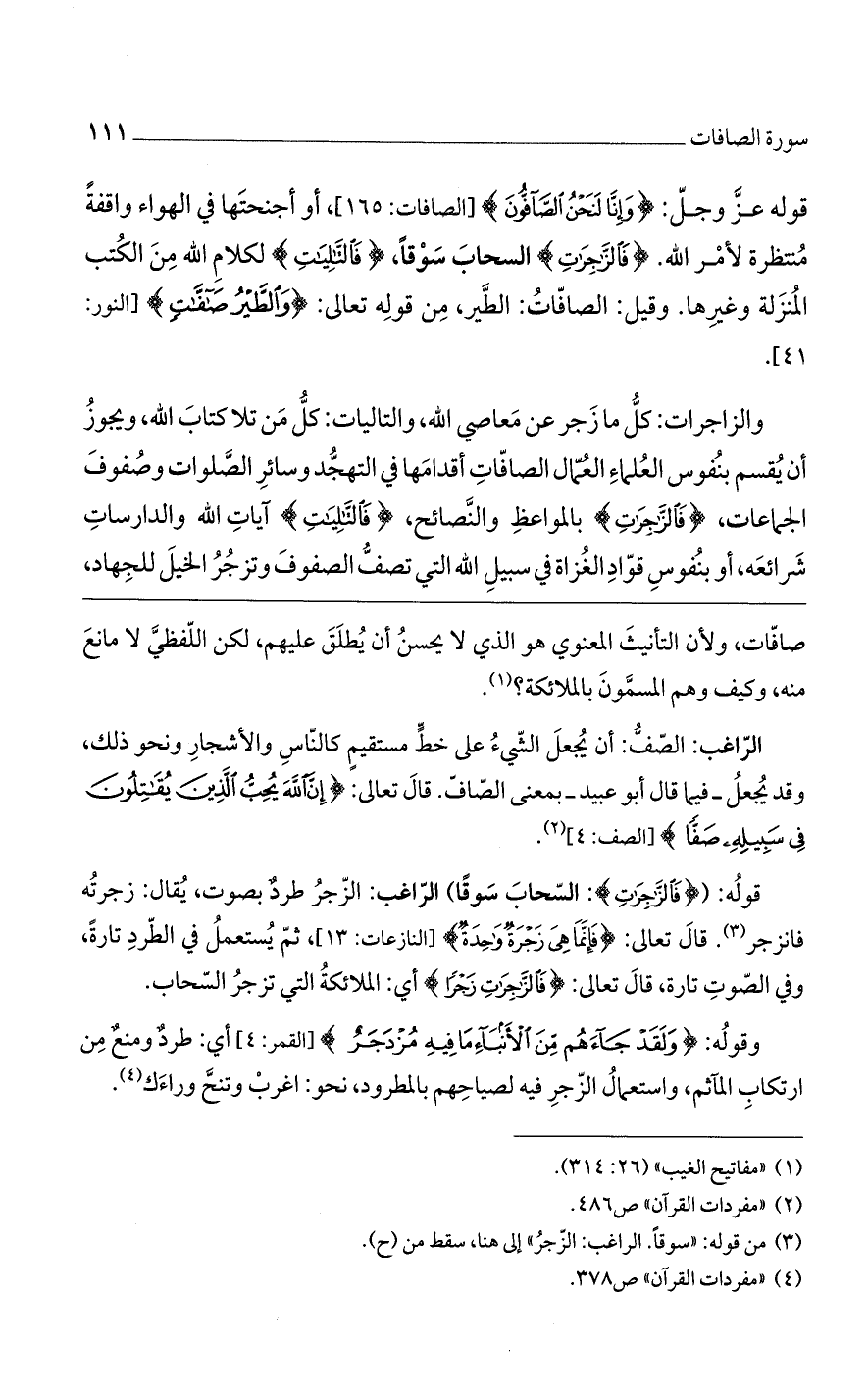قوله عز وجل: {وإنَّا لَنَحْنُ الصَّافُّونَ} [الصافات: 165]، أو أجنحتها في الهواء واقفة منتظرة لأمر الله. {فَالزَّاجِرَاتِ} السحاب سوقًا، {فَالتَّالِيَاتِ} لكلام الله من الكتب المنزلة وغيرها. وقيل: الصافات: الطير، من قوله تعالى: {وَالطَّيْرُ صَافَّاتٍ} [النور: 41].