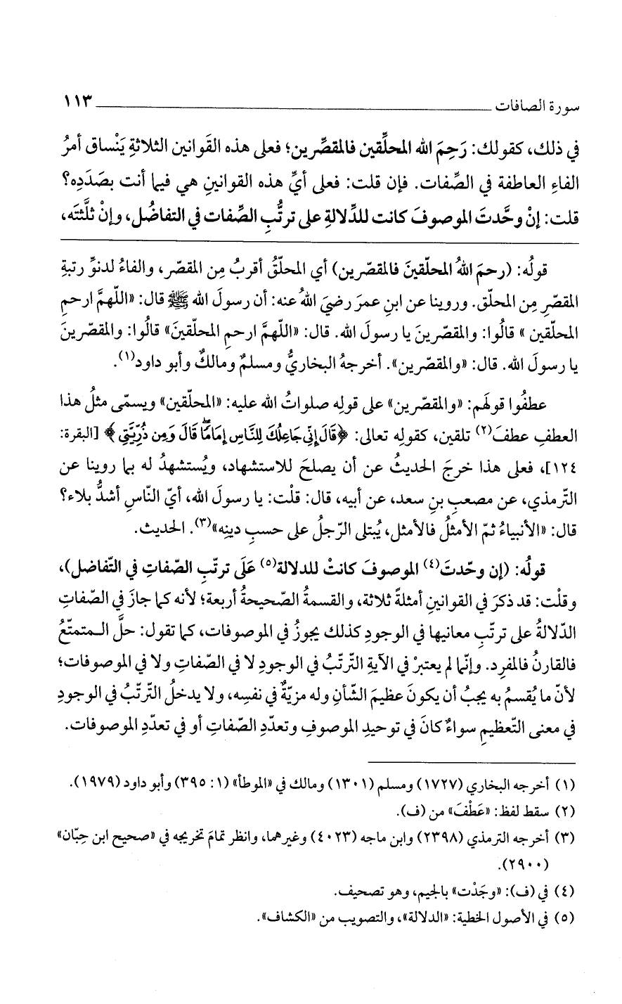 قوله: (إن وحدت الموصوف كانت للدلالة على ترتب الصفات في التفاضل)، وقلت: قد ذكر في القوانين أمثلة ثلاثة، والقسمة الصحيحة أربعة؛ لأنه كما جاز في الصفات الدلالة على ترتب معانيها في الوجود كذلك يجوز في الموصوفات، كما تقول: حل المتمتع فالقارن فالمفرد. وإنما لم يعتبر في الآية الترتب في الوجود لا في الصفات ولا في الموصوفات؛ لأن ما يقسم به يجب أن يكون عظيم الشأن وله مزية في نفسه، ولا يدخل الترتب في الوجود في معنى التعظيم سواء كان في توحيد الموصوف وتعدد الصفات أو في تعدد الموصوفات.