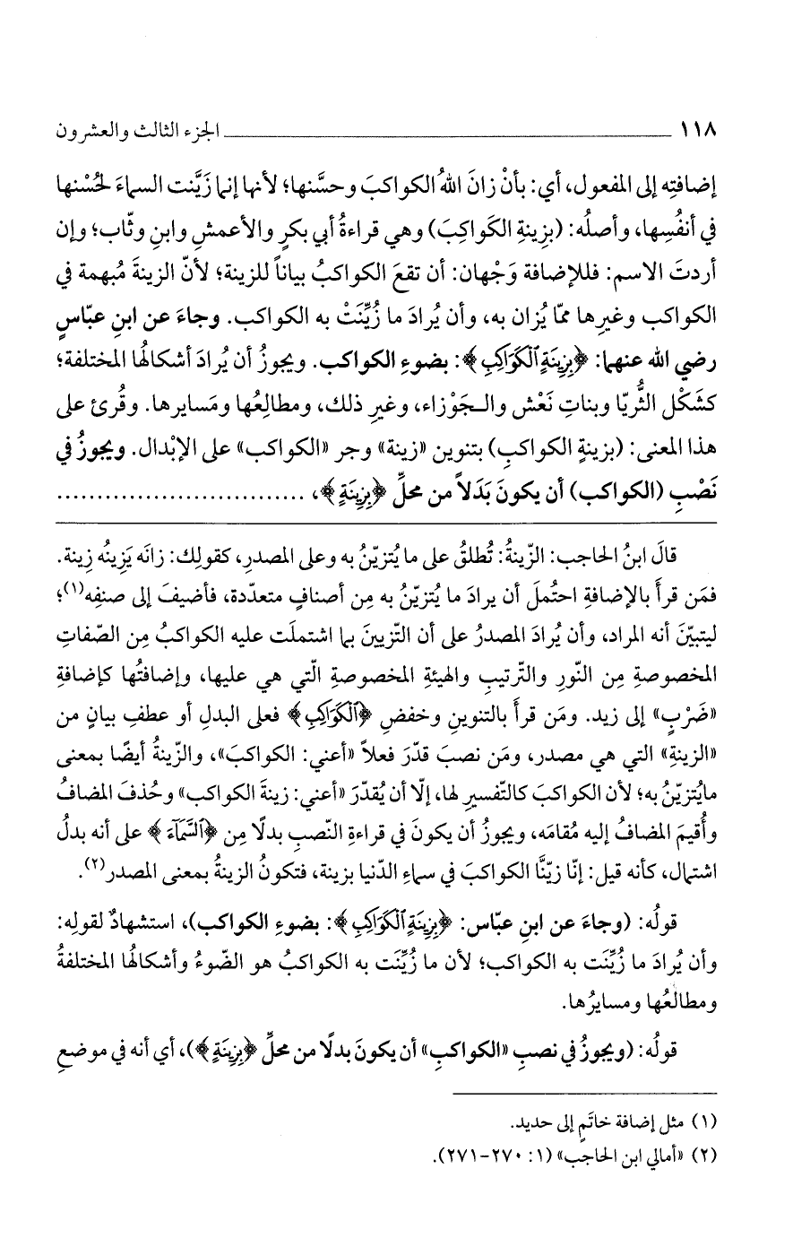 قوله: (وجاء عن ابن عباس: {بِزِينَةٍ الكَوَاكِبِ}: بضوء الكواكب)، استشهاد لقوله: وأن يراد ما زينت به الكواكب؛ لأن ما زينت به الكواكب هو الضوء وأشكالها المختلفة ومطالعها ومسايرها.