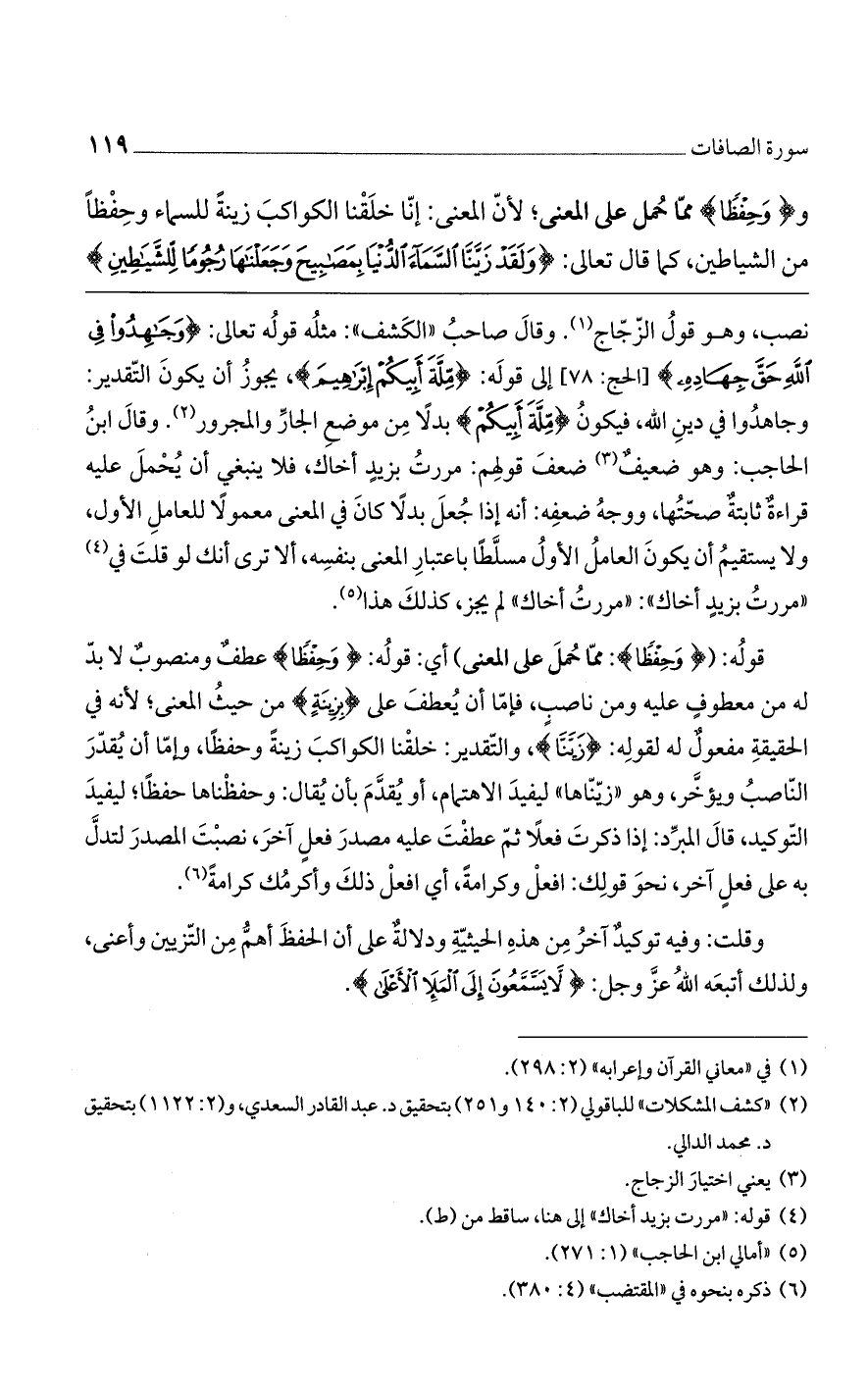 و {وحِفْظًا} مما حمل على المعنى؛ لأن المعنى: إنا خلقنا الكواكب زينة للسماء وحفظًا من الشياطين، كما قال تعالى: {وَلَقَدْ زَيَّنَّا السَّمَاءَ الدُّنْيَا بِمَصَابِيحَ وَجَعَلْنَاهَا رُجُومًا لِلشَّيَاطِينِ}