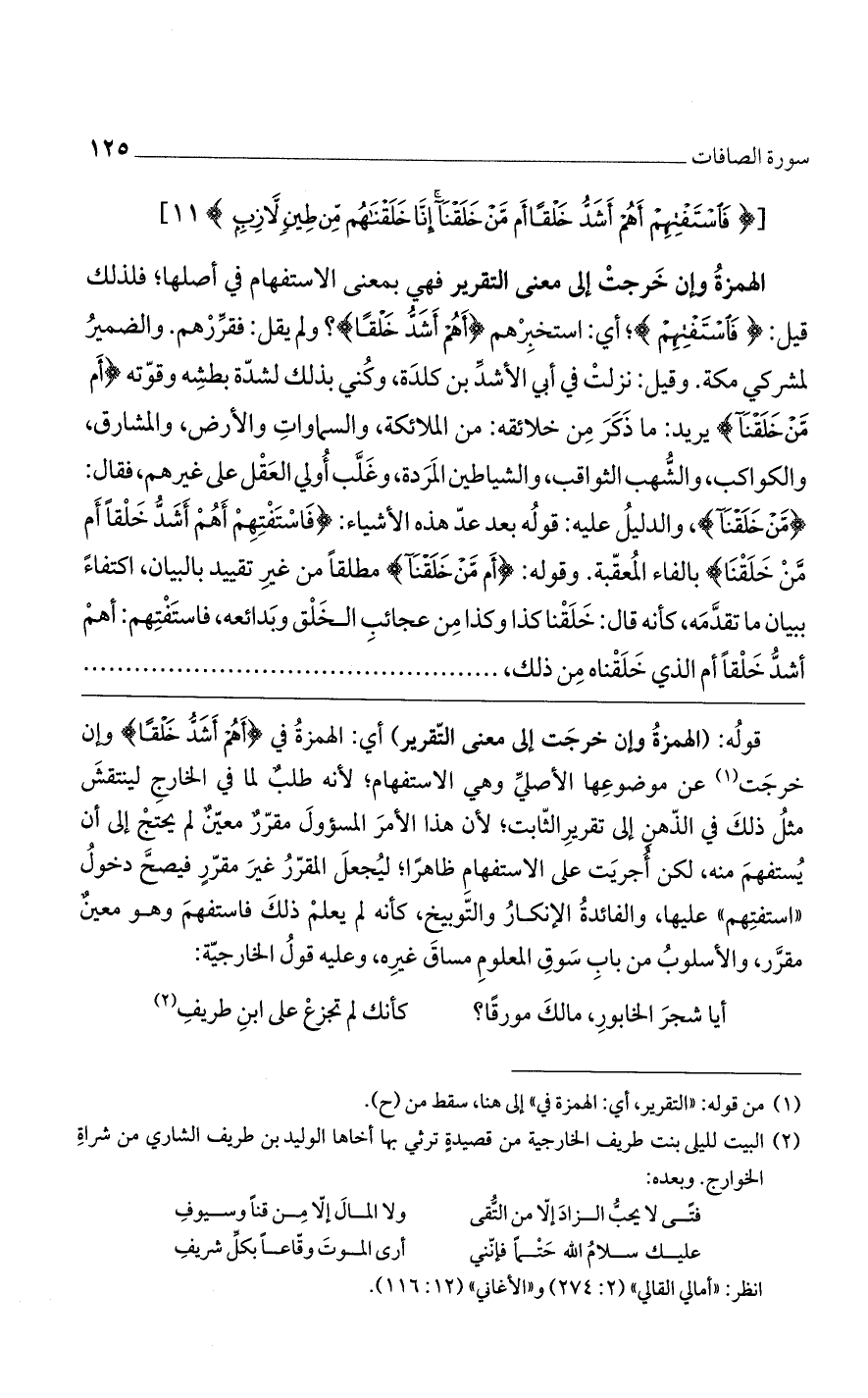 قوله: (الهمزة وإن خرجت إلى معنى التقرير) أي: الهمزة في {أَهُمْ أَشَدُّ خَلْقًا} وإن خرجت عن موضوعها الأصلي وهي الاستفهام؛ لأنه طلب لما في الخارج لينتقش مثل ذلك في الذهن إلى تقرير الثابت؛ لأن هذا الأمر المسؤول مقرر معين لم يحتج إلى أن يستفهم منه، لكن أجريت على الاستفهام ظاهرًا؛ ليجعل المقرر غير مقرر فيصح دخول "استفتهم" عليا، والفائدة الإنكار والتوبيخ، كأنه لم يعلم ذلك فاستفتهم وهو معين مقرر، والأسلوب من باب سوق المعلوم مساق غيره، وعليه قول الخارجية: