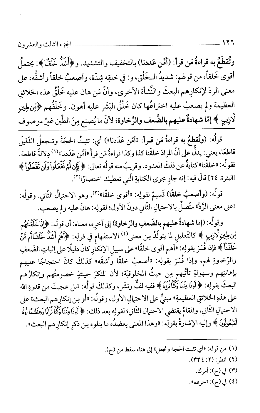 قوله: (وتقطع به قراءة من قرأ: "أمن عددنا") أي: تثبت الحجة وتجعل الدليل قاطعًا، يعني: يدل على أن المراد خلقنا كذا وكذا قراءة من قرأ "أمن عددنا" دلالة قاطعة.