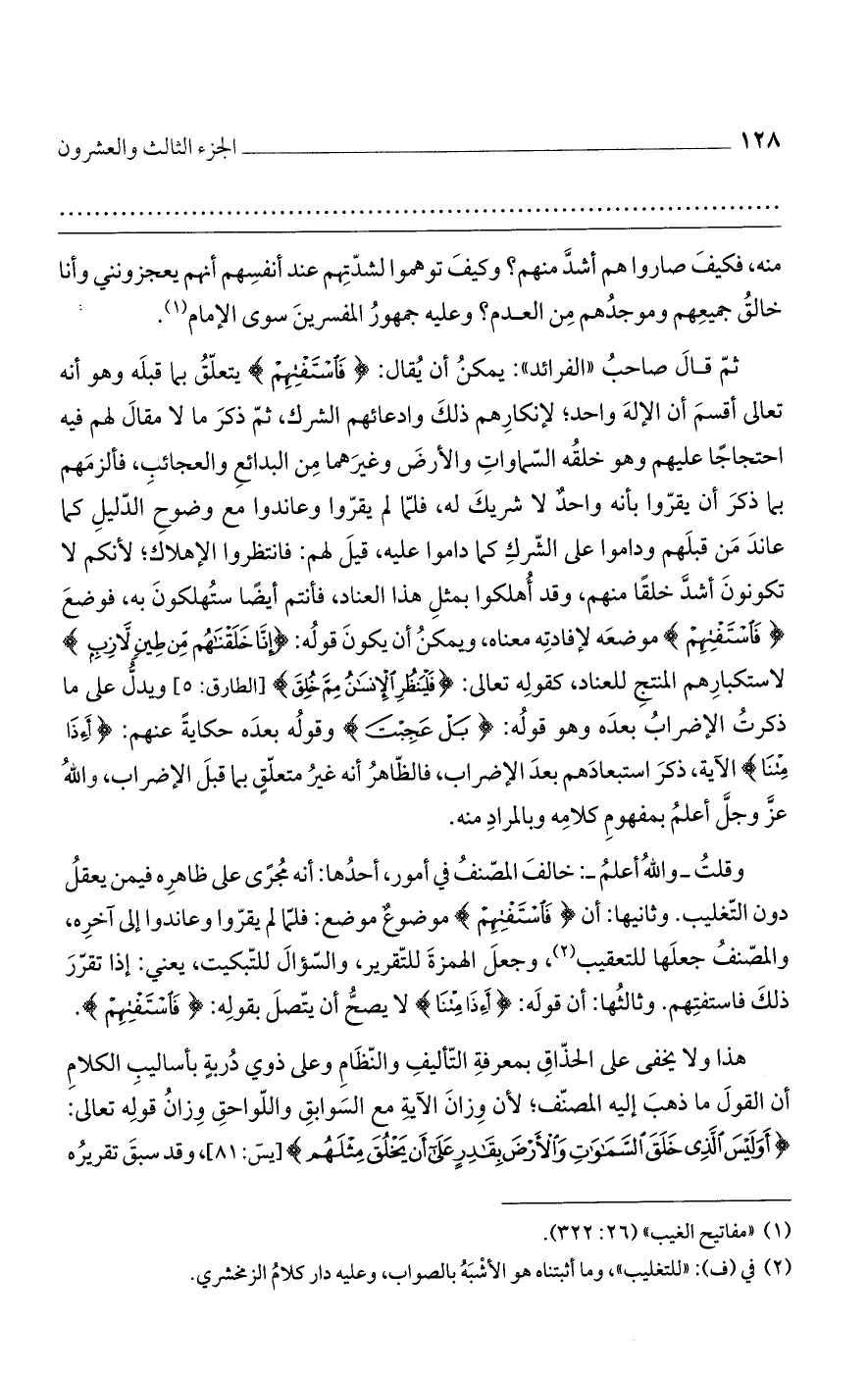 ثم قال صاحب "الفرائد": يمكن أن يقال: {فَاسْتَفْتِهِمْ} يتعلق بما قبله وهو أنه تعالى أقسم أن الإله واحد؛ لإنكارهم ذلك وادعائهم الشرك، ثم ذكر ما لا مقال لهم فيه احتجاجًا عليهم وهو خلقه السماوات والأرض وغيرهما من البدائع والعجائب، فألزمهم بما ذكر أن يقروا بأنه واحد لا شريك له، فلما لم يقروا وعاندوا مع وضوح الدليل كما عاند من قبلهم وداموا على الشرك كما داموا عليه، قيل لهم: فانتظروا الإهلاك؛ لأنكم لا تكونون أشد خلقًا منهم، وقد اُهلكوا بمثل هذا العناد، فأنتم أيضًا ستهلكون به، فوضع {فَاسْتَفْتِهِمْ} موضعه لإفادته معناه، ويمكن أن يكون قوله: {إنَّا خَلَقْنَاهُم مِّن طِينٍ لاَّزِبٍ} لاستكبارهم المنتج للعناد، كقوله تعالى: {فَلْيَنْظُرِ الْإِنْسَانُ مِمَّ خُلِقَ} [الطارق: 5] ويدل على ما ذكرت الإضراب بعده وهو قوله: {بَلْ عَجِبْتَ} وقوله بعده حكاية عنهم: {أَئِذَا مِتْنَا} الآية، ذكر استبعادهم بعد الإضراب، فالظاهر أنه غير متعلق بما قبل الإضراب، والله عز وجل أعلم بمفهوم كلامه وبالمراد منه.