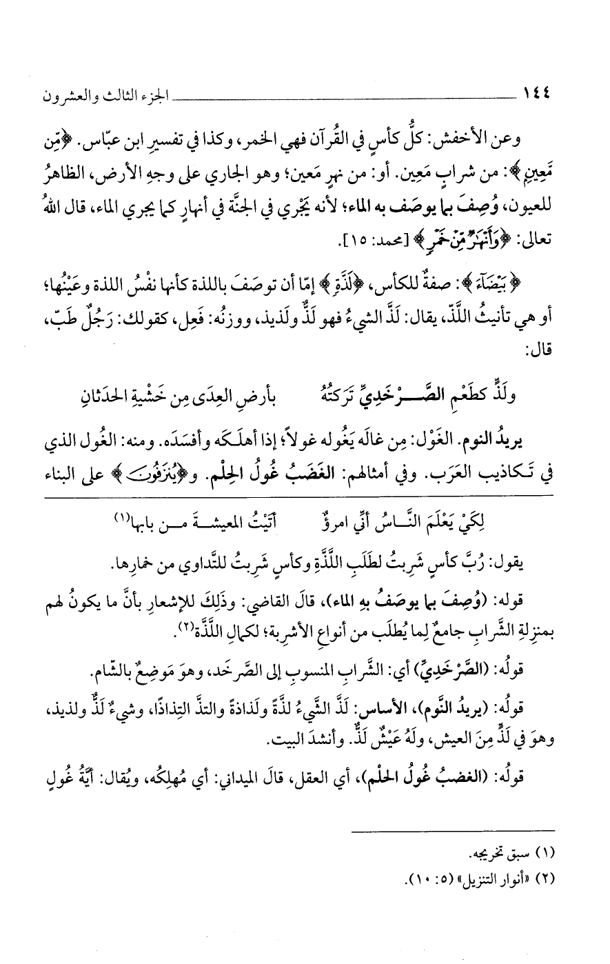 قوله: (وصف بما يوصف به الماء)، قال القاضي: وذلك للإشعار بأن ما يكون لهم بمنزلة الشراب جامع لما يطلب من أنواع الأشربة؛ لكمال اللذة.