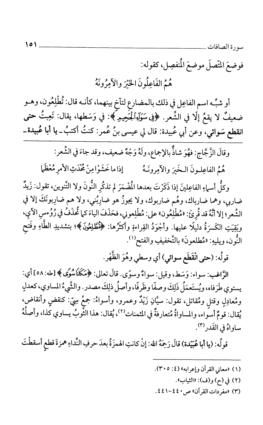 وكل أسماء الفاعلين إذا ذكرت بعدها المضمر لم تذكر النون ولا التنوين، تقول: زيد ضاربي، وهما ضارباك، وهم ضاربوك، ولا يجوز هو ضاربني، ولا هم ضاربونك إلا في الشعر؛ إلا أنه قد قرئ: "مطلعون" على: مطلعوني، فحذف الياء كما تحذف في رؤوس الآي، وبقيت الكسرة دليلًا عليها. وأجود القراءة وأكثرها: {مُّطَّلِعُونَ}؛ بتشديد الطاء وفتح النون، ويليه: "مطلعون" بالتخفيف والفتح.