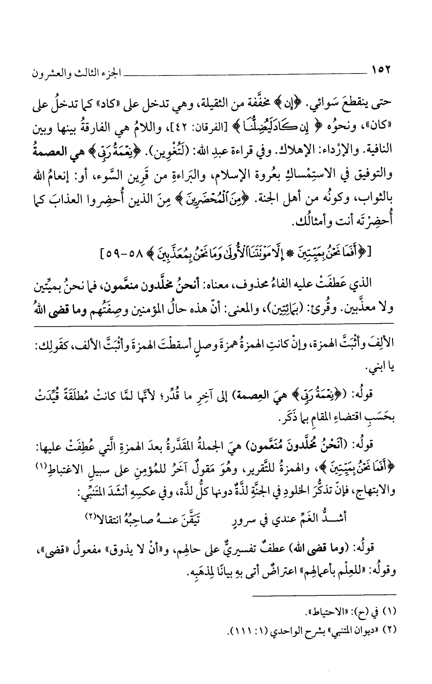 حتى ينقطع سوائي. {إِن} مخففة من الثقيلة، وهي تدخل على "كاد" كما تدخل على "كاد"، ونحوه {إِنْ كَادَ لَيُضِلُّنَا} [الفرقان: 42]، واللام هي الفارقة بينها وبين النافية. والإرداء: الإهلاك. وفي قراءة عبد الله: (لتُغوِين). {نِعْمَةُ رَبِّي} هي العصمة والتوفيق في الاستمساك بعروة الإسلام، والبراءة من قرين السوء، أو: إنعام الله بالثواب، وكونه من أهل الجنة. {مِنَ المُحْضَرِينَ} من الذين أحضروا العذاب كما أحضرته أنت وأمثالك.