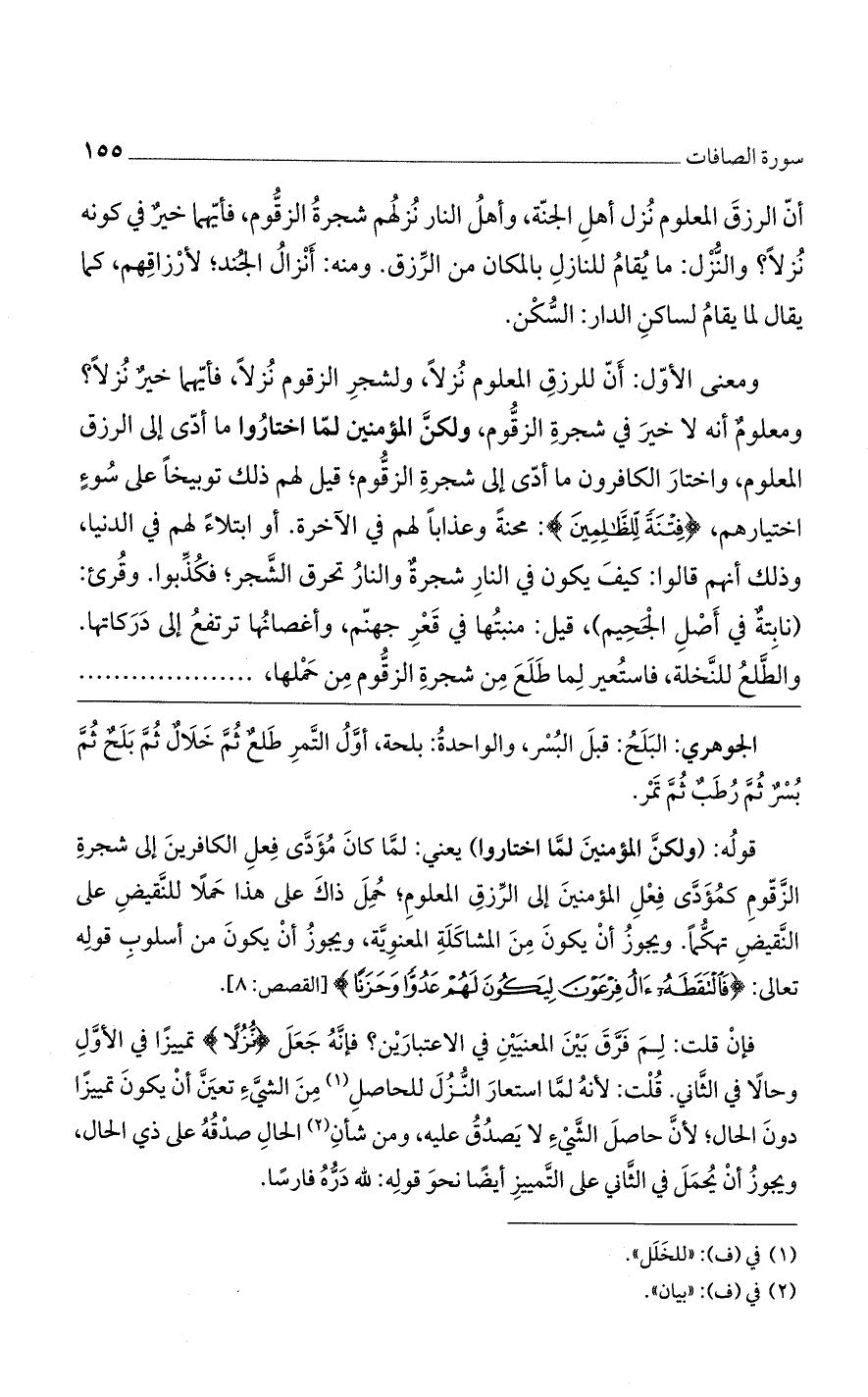 ومعنى الأول: أن للرزق المعلوم نزلًا، ولشجر الزقوم نزلًا، فأيهما خير نزلًا؟ ومخعلوم أنه لا خير في شجرة الزقوم، ولكن المؤمنين لما اختاروا ما أدى إلى الرزق المعلوم، واختار الكافرون ما أدى إلى شجرة الزقوم؛ قيل لهم ذلك توبيخًا على سوء اختيارهم، {فِتْنَةً لِّلظَّالِمِينَ}: محنة وعذابًا لهم في الآخرة. أو ابتلاءً لهم في الدنيا، وذلك أنهم قالوا: كيف يكون في النار شجرة والنار تحرق الشجر؛ فكذبوا. وقرئ: (نابتة في أصل الجحيم)، قيل: منبتها في قعر جهنم، وأغصانها ترتفع إلى دركاتها. والطلع للنخلة، فاستعير لما طلع من شجرة الزقوم من حملها،