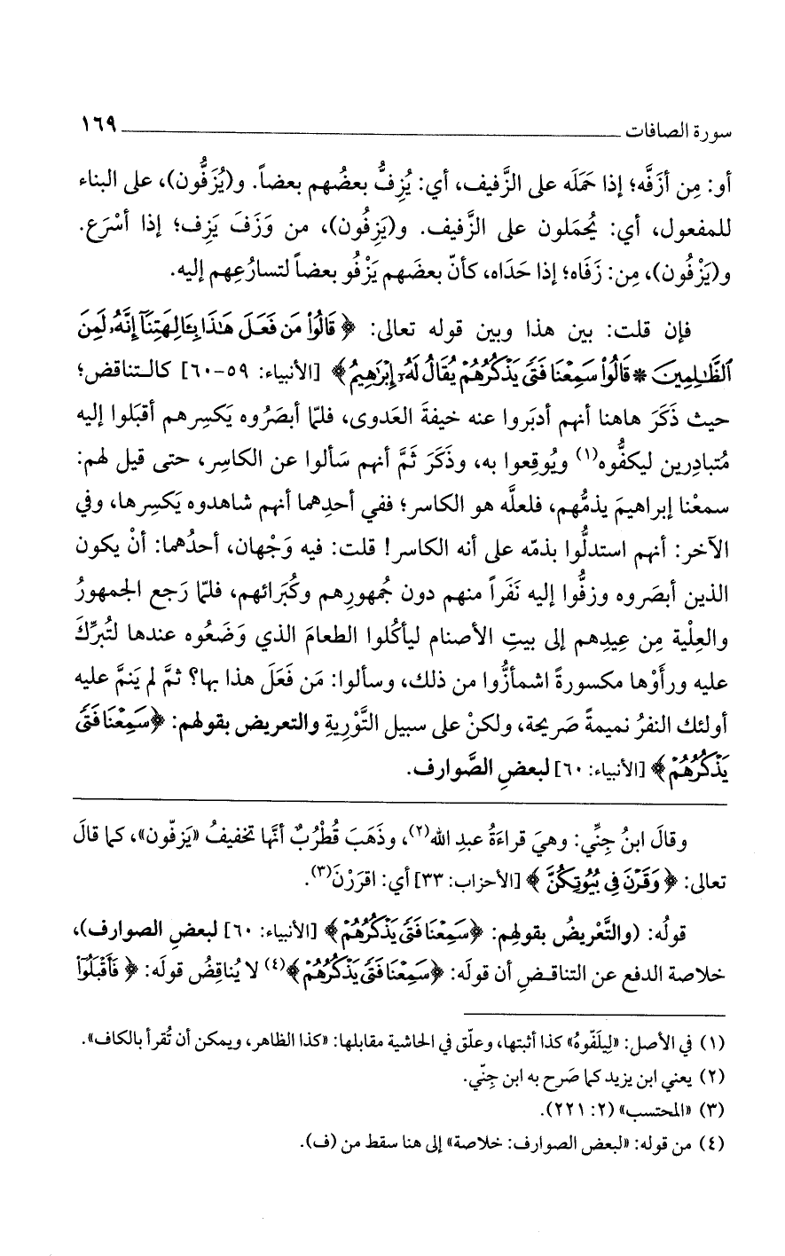 قوله: (والتعريض بقولهم: {سَمِعْنَا فَتًى يَذْكُرُهُمْ} [الأنبياء: 60] لبعض الصوارف)، خلاصة الدفع عن التناقض أن قوله: {سَمِعْنَا فَتًى يَذْكُرُهُمْ} لا يناقض قوله: {فَأَقْبَلُوا