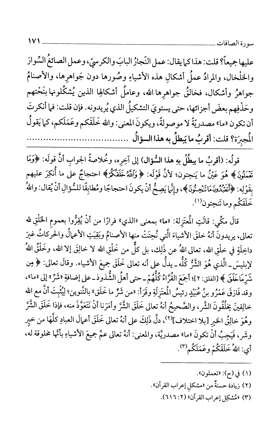 عليها جميعًا؟ قلت: هذا كما يقال: عمل النجار الباب والكرسي، وعمل الصائغ السوار والخلخال، والمراد عمل أشكال هذه الأشياء وصورها دون جواهرها، والأصنام جواهر وأشكال، فخالق جواهرها الله، وعامل أشكالها الذين يشكلونها بنحتهم وحذفهم بعض أجزائها، حتى يستوي التشكيل الذي يريدونه. فإن قلت: فما أنكرت أن تكون "ما" مصدرية لا موصولة، ويكون المعنى: والله خلقكم وعملكم، كما يقول المجبرة؟ قلت: أقرب ما يبطل به السؤال