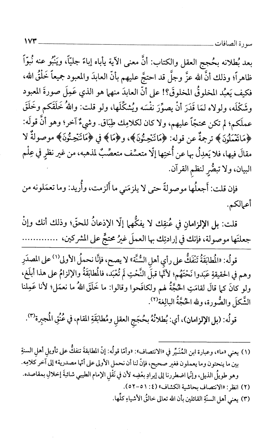 بعد بطلانه بحجج العقل والكتاب: أن معنى الآية يأباه إباء جليًا، وينبؤ عنه نبوًا ظاهرًا؛ وذلك أن الله عز وجل قد احتج عليهم بأن العابد والمعبود جميعًا خلق الله، فكيف يعبد المخلوق المخلوق؟ ! على أن العابد منهما هو الذي عمل صورة المعبود وشكله، ولولاه لما قدر أن يصور نفسه ويشكلها، ولو قلت: والله خلقكم وخلق عملكم؛ لم تكن محتجًا عليهم، ولا كان لكلامك طباق. وشيء آخر؛ وهو أن قوله: {وَمَا تَعْمَلُونَ} ترجمة عن قوله: {مَا تَنْحِتُونَ}، و {مَا} في {مَا تَنْحِتُونَ} موصولة لا مقال فيها، فلا يعدل بها عن أختها إلا متعسف متعصب لمذهبه، من غير نظر في علم البيان، ولا تبصر لنظم القرآن.