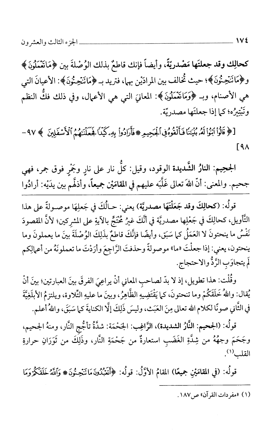 قوله: (كحالك وقد جعلتها مصدرية) يعني: حالك في جعلها موصولة على هذا التأويل، كحالك في جعلها مصدرية في أنك غير محتج بالآية على المشركين؛ لأن المقصود نفس ما ينحتون لا العمل كما سبق، وأيضًا فإنك قاطع بذلك الوصلة بين ما يعملون وما ينحتون، يعني: إذا جعلت "ما" موصولة وحذفت الراجع وأردت ما تعملونه من أعمالكم لم يتجاوب الرد والاحتجاج.