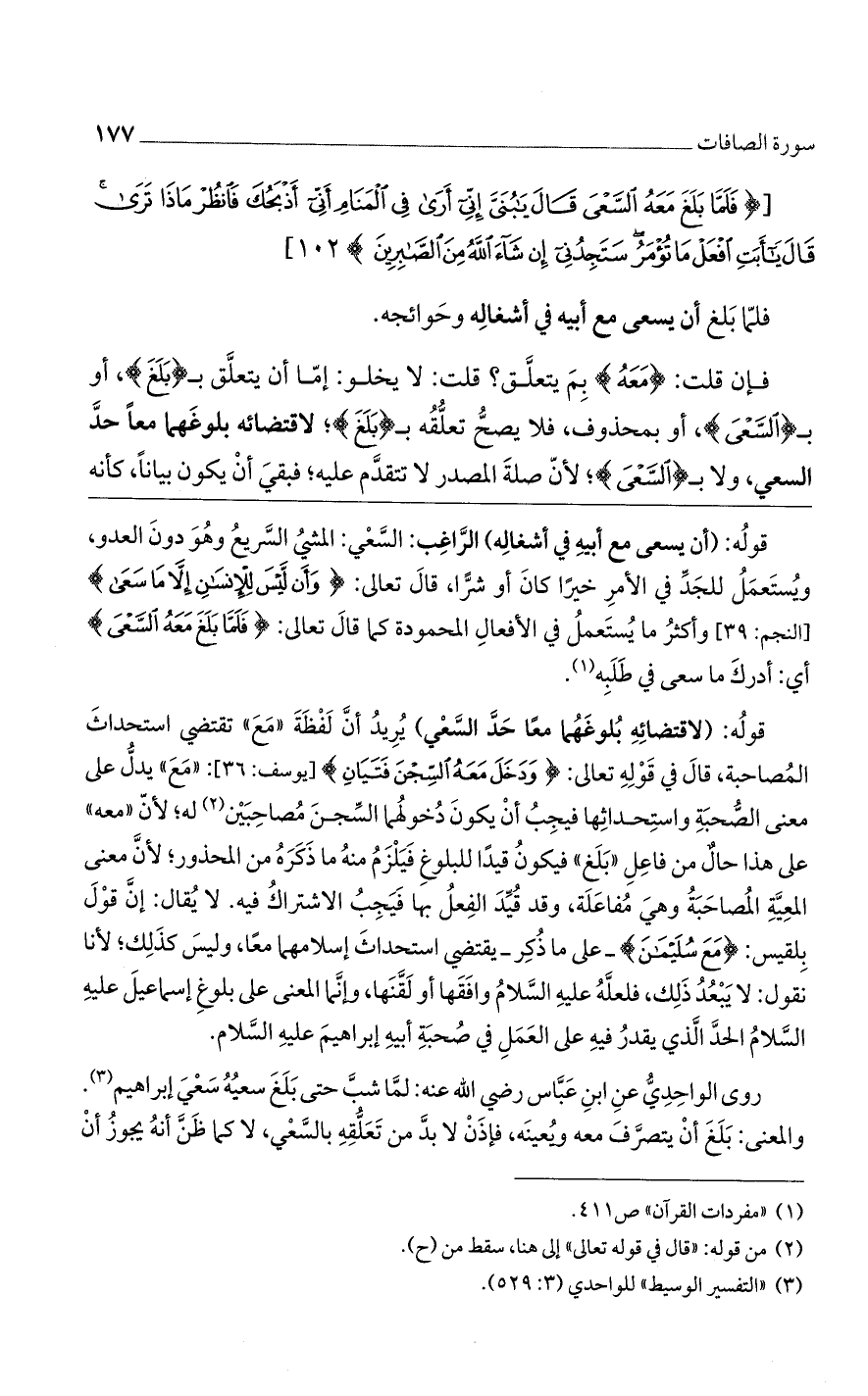 قوله: (لاقتضائه بلوغهما معًا حد السعي) يريد أن لفظة "مع" تقتضي استحداث المصاحبة، قال في قوله تعالى: {دَخَلَ مَعَهُ السِّجْنَ فَتَيَانِ} [يوسف: 36]: "مع" يدل على معنى الصحبة واستحداثها فيجب أن يكون دخولهما السجن مصاحبين له؛ لأن "معه" على هذا حال من فاعل "بلغ" فيكون قيدًا للبلوغ فيلزم منه ما ذكره من المحذور؛ لأن معنى المعية المصاحبة وهي مفاعلة، وقد قيد الفعل بها فيجب الاشتراك فيه. لا يقال: إن قول بلقيس: {مَعَ سُلَيْمَانَ} -على ما ذكر- يقتضي استحداث إسلامهما معًا، وليس كذلك؛ لأنا نقول: لا يبعد ذلك، فلعله عليه السلام وافقها أو لقنها، وإنما المعنى على بلوغ إسماعيل عليه السلام الحد الذي يقدر فيه على العمل في صحبة أبيه إبراهيم عليه السلام.