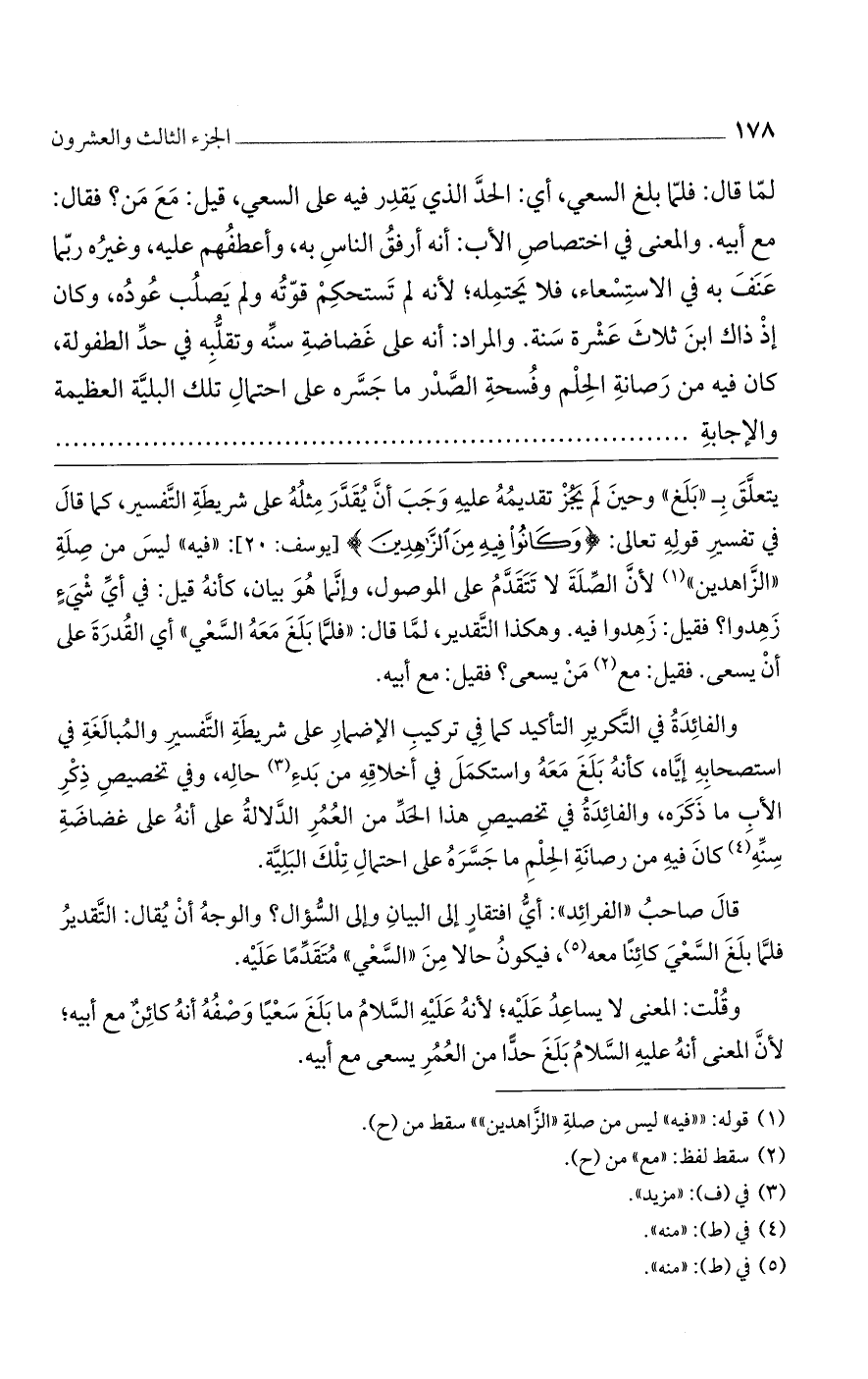 وقلت: المعنى لا يساعد عليه؛ لأنه عليه السلام ما بلغ سعيًا وصفه أنه كائن مع أبيه؛ لأن المعنى أنه عليه السلام بلغ حدًا من العمر يسعى مع أبيه.
