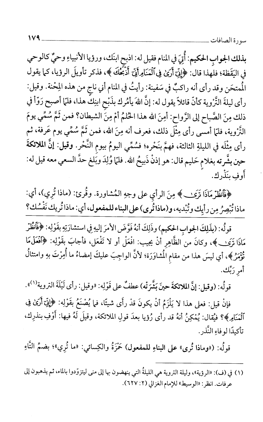 بذلك الجواب الحكيم: أتى في المنام فقيل له: اذبح ابنك، ورؤيا الأنبياء وحي كالوحي في اليقظة؛ فلهذا قال: {إِنِّي أَرَى فِي الْمَنَامِ أَنِّي أَذْبَحُكَ}، فذكر تأويل الرؤيا، كما يقول الممتحن وقد رأى أنه راكب في سفينة: رأيت في المنام أني ناج من هذه المحنة. وقيل: رأى ليلة التروية كأن قائلًا يقول له: إن الله يأمرك بذبح ابنك هذا، فلما أصبح رَوَّا في ذلك من الصباح إلى الرواح: أمن الله هذا الحلم أم من الشيطان؟ فمن ثم سمي يوم التروية، فلما أمسى رأى مثل ذلك، فعرف أنه من الله، ثم سمي يوم عرفة، ثم رأى مثله في الليلة الثالثة، فهم بنحره؛ فسمي اليوم بيوم النحر. وقيل: إن الملائكة حين بشرته بغلام حليم قال: هو إذن ذبيح الله. فلما ولد وبلغ حد السعي معه قيل له: أوف بنذرك.