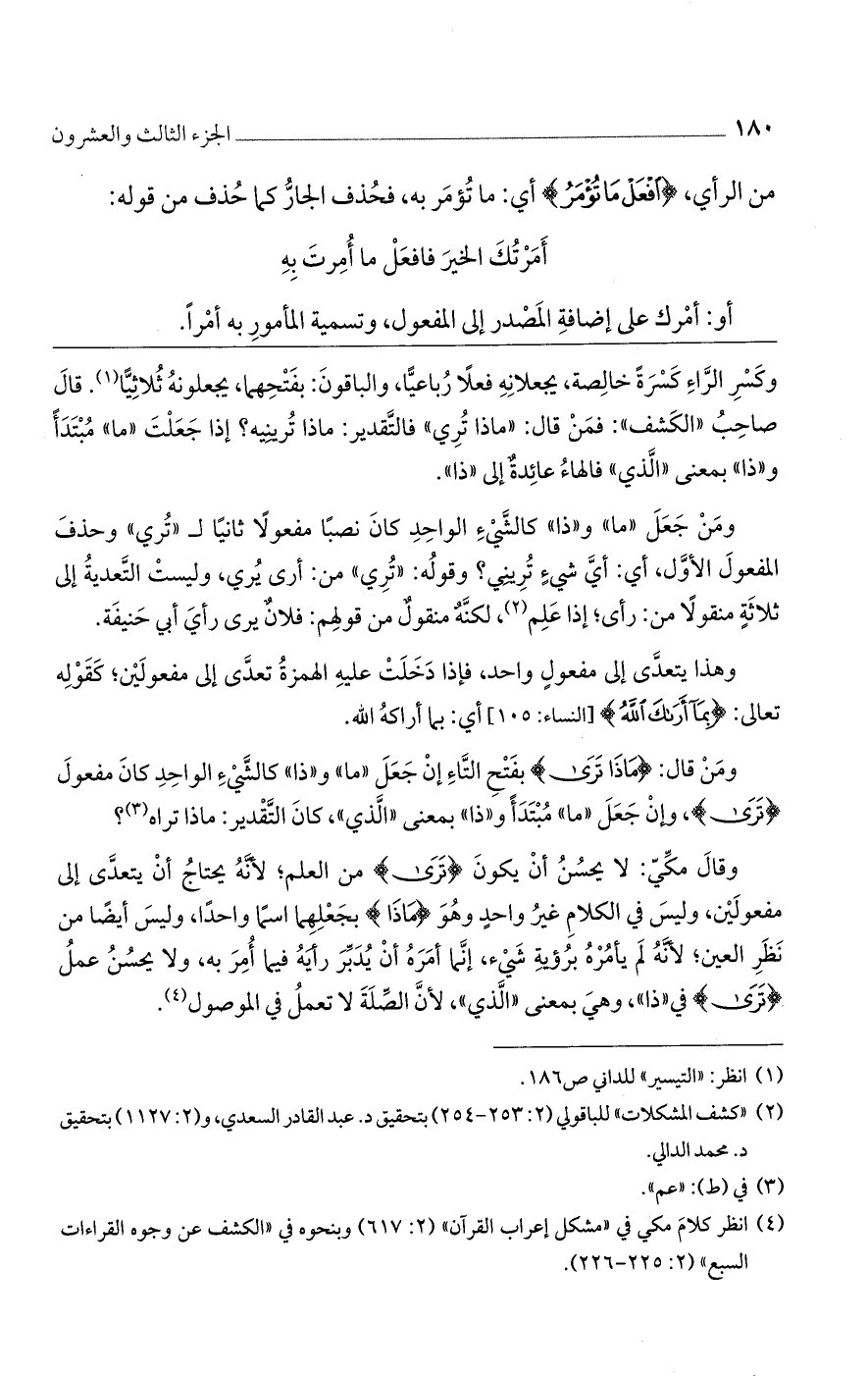 وكسر الراء كسرة خالصة، يجعلانه فعلًا رباعيًا، والباقون: بفتحهما، يجعلونه ثلاثيًا، قال صاحب "الكشف": فمن قال: "ماذا تري" فالتقدير: ماذا ترينيه؟ إذا جعلت "ما" مبتدأ و"ذا" بمعنى "الذي" فالهاء عائدة إلى "ذا".