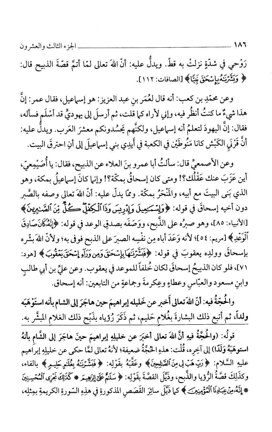 وعن الأصمعي قال: سألت أبا عمرو بن العلاء عن الذبيح، فقال: يا أصميعي، هو أين عزب عنك عقلك؟ ! ومتى كان إسحاق بمكة؟ ! وإنما كان إسماعيل بمكة، وهو الذي بنى البيت مع أبيه، والمنحر بمكة. ومما يدل عليه: أن الله تعالى وصفه بالصبر دون أخيه إسحاق في قوله: {وَإِسْمَاعِيلَ وَإِدْرِيسَ وَذَا الْكِفْلِ كُلٌّ مِنَ الصَّابِرِينَ} [الأنبياء: 85]، وهو من صبره على الذبح، ووصفه بصدق الوعد في قوله: {إِنَّهُ كَانَ صَادِقَ الْوَعْدِ} [مريم: 54]؛ لأنه وعد أباه من نفسه الصبر على الذبح فوفى به؛ ولأن الله بشره بإسحاق وولده يعقوب في قوله {فَبَشَّرْنَاهَا بِإِسْحَاقَ وَمِنْ وَرَاءِ إِسْحَاقَ يَعْقُوبَ} [هود: 71]، فلو كان الذبيح إسحاق لكان خلفًا للموعد في يعقوب. وعن علي بن أبي طالب وابن مسعود والعباس وعطاء وعكرمة وجماعة من التابعين: أنه إسحاق.