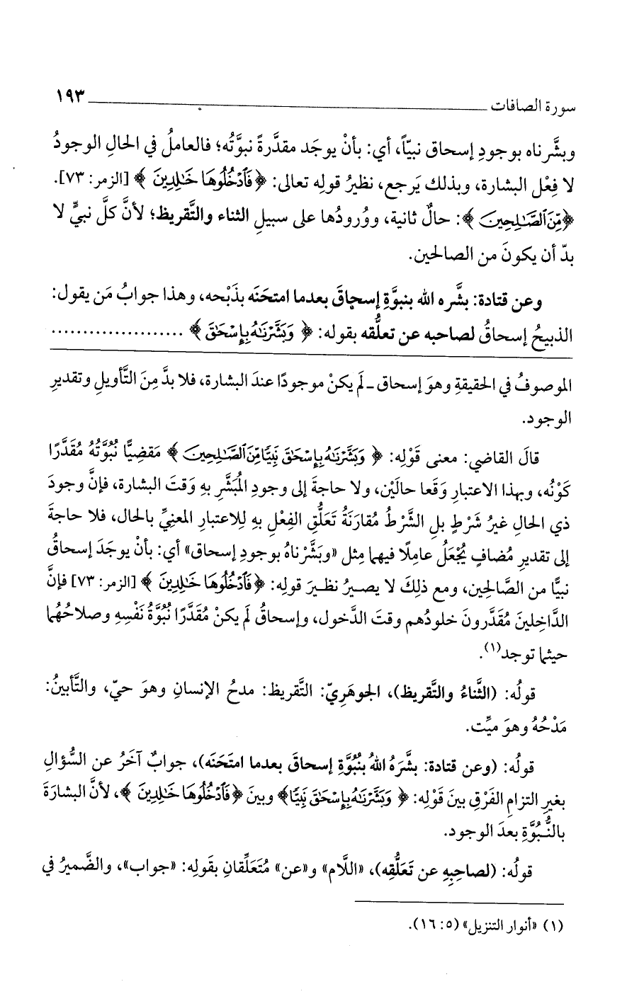 قال القاضي: معنى قوله {وَبَشَّرْنَاهُ بِإِسْحَاقَ نَبِيًّا مِنَ الصَّالِحِينَ} مقضيًا نبوته مقدرًا كونه، وبهذا الاعتبار وقعا حالين، ولا حاجة إلى وجود المبشر به وقت البشارة، فإن وجود ذي الحال غير شرط بل الشرط مقارنة تعلق الفعل به للاعتبار المعني بالحال، فلا حاجة إلى تقدير مضاف يجعل عاملًا فيهما مثل "وبشرناه بوجود إسحاق" أي: بأن يوجد إسحاق نبيًا من الصالحين، ومع ذلك لا يصير نظير قوله: {فَادْخُلُوهَا خَالِدِينَ} [الزمر: 73] فإن الداخلين مقدورون خلودهم وقت الدخول، وإسحاق لم يكن مقدرًا نبوة نفسه وصلاحهما حيثما توجد.