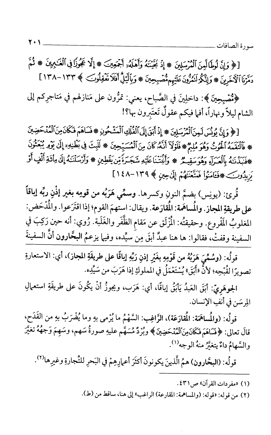 [{وَإِنَّ يُونُسَ لَمِنَ الْمُرْسَلِينَ * إِذْ أَبَقَ إِلَى الْفُلْكِ الْمَشْحُونِ * فَسَاهَمَ فَكَانَ مِنَ الْمُدْحَضِينَ * فَالْتَقَمَهُ الْحُوتُ وَهُوَ مُلِيمٌ * فَلَوْلَا أَنَّهُ كَانَ مِنَ الْمُسَبِّحِينَ * لَلَبِثَ فِي بَطْنِهِ إِلَى يَوْمِ يُبْعَثُونَ * فَنَبَذْنَاهُ بِالْعَرَاءِ وَهُوَ سَقِيمٌ * وَأَنْبَتْنَا عَلَيْهِ شَجَرَةً مِنْ يَقْطِينٍ * وَأَرْسَلْنَاهُ إِلَى مِئَةِ أَلْفٍ أَوْ يَزِيدُونَ * فَآَمَنُوا فَمَتَّعْنَاهُمْ إِلَى حِينٍ} 139 - 148].