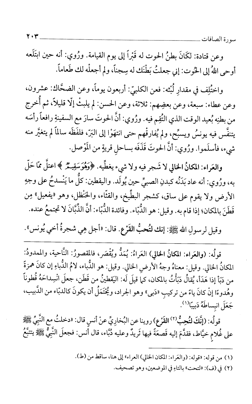 قوله: (والعراء: المكان الخالي) العراء: يمد ويقصر، فالمقصور: الناحية، والممدود: المكان الخالي. وقيل: معناه الأرض الخالي. وقيل: هو الدباء، لأم الدباء إن كان همزة من دبأ إذا هذا، يقال دبأت المكان، كما قيل له: اليقطين من قطن، جعل انسداحه قطونًا وهدوءًا إن كان ياء من تركيب "دبي" وهو الجراد، ويحتمل أن يكون كالدباء من الدبيب، جعل انبساطه دبيبا.