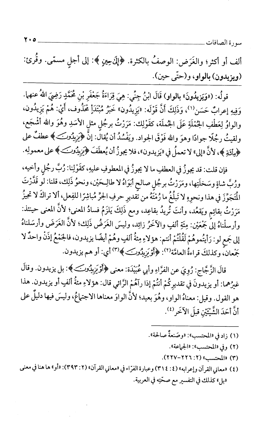 قوله: ("ويزيدون" بالواو) قال ابن جني: هي قراءة جعفر بن محمد رضي الله عنهما. وفيه إعراب حسن، وذلك أن قوله: "يزيدون" خبر مبتدأ محذوف، أي: هم يزيدون، والواو لعطف الجملة على الجملة، كقولك: مررت برجل مثل الأسد وهو والله أشجع، ولقيت رجلا جوادا وهو والله فوق الجواد. ويفسد أن يقال: إن {يَزِيدُونَ} عطف على {مِئَةِ}، لأن "إلى" لا تعمل في "يزيدون"، فلا يجوز أن يعطف {يَزِيدُونَ} على معموله.