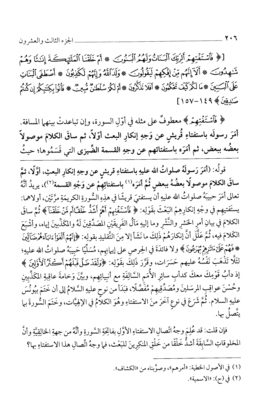 قوله: (أمر رسوله صلوات الله عليه باستفتاء قريش عن وجه إنكار البعث، أولا، ثم ساق الكلام موصولًا بعضه ثم أمره باستفتائهم عن وجه القسمة)، يريد أنه تعالى أمر حبيبه صلوات الله عليه أن يستفتي قريشًا في هذه السورة الكريمة مرتين، أولاهما: يستفتيهم في وجه إنكارهم البعث بقوله: {فَاسْتَفْتِهِمْ أَهُمْ أَشَدُّ خَلْقًا أَمْ مَنْ خَلَقْنَا} ثم ساق الكلام في بيان أمر الحشر والنشر وما إليه مآل الفريقين المصدقين له والمكذبين إياه، وأشبع الكلام فيه، ثم علل أن إنكارهم ذلك ما نشأ إلا من التقليد بقوله: {إِنَّهُمْ أَلْفَوْا آَبَاءَهُمْ ضَالِّينَ * فَهُمْ عَلَى آَثَارِهِمْ يُهْرَعُونَ} ولا فائدة في الحرص على إيمانهم، مسليا حبيبه صلوات الله عليه؛ لئلا تذهب نفسه عليهم حسرات، وقرر ذلك بقوله: {وَلَقَدْ ضَلَّ قَبْلَهُمْ أَكْثَرُ الْأَوَّلِينَ} إذ دأب قومك معك كدأب سائر الأمم السالفة مع أنبيائهم، وبين وخامة عاقبة المكذبين وحسن عواقب المرسلين ومصدقيهم مفصلًا، فبدأ من نوح عليه السلام إلى أن ختم بيونس عليه السلام. ثم شرع في نوع آخر من الاستفتاء وهو الكلام في الإلهيات، وختم السورة بما يتصل بها.