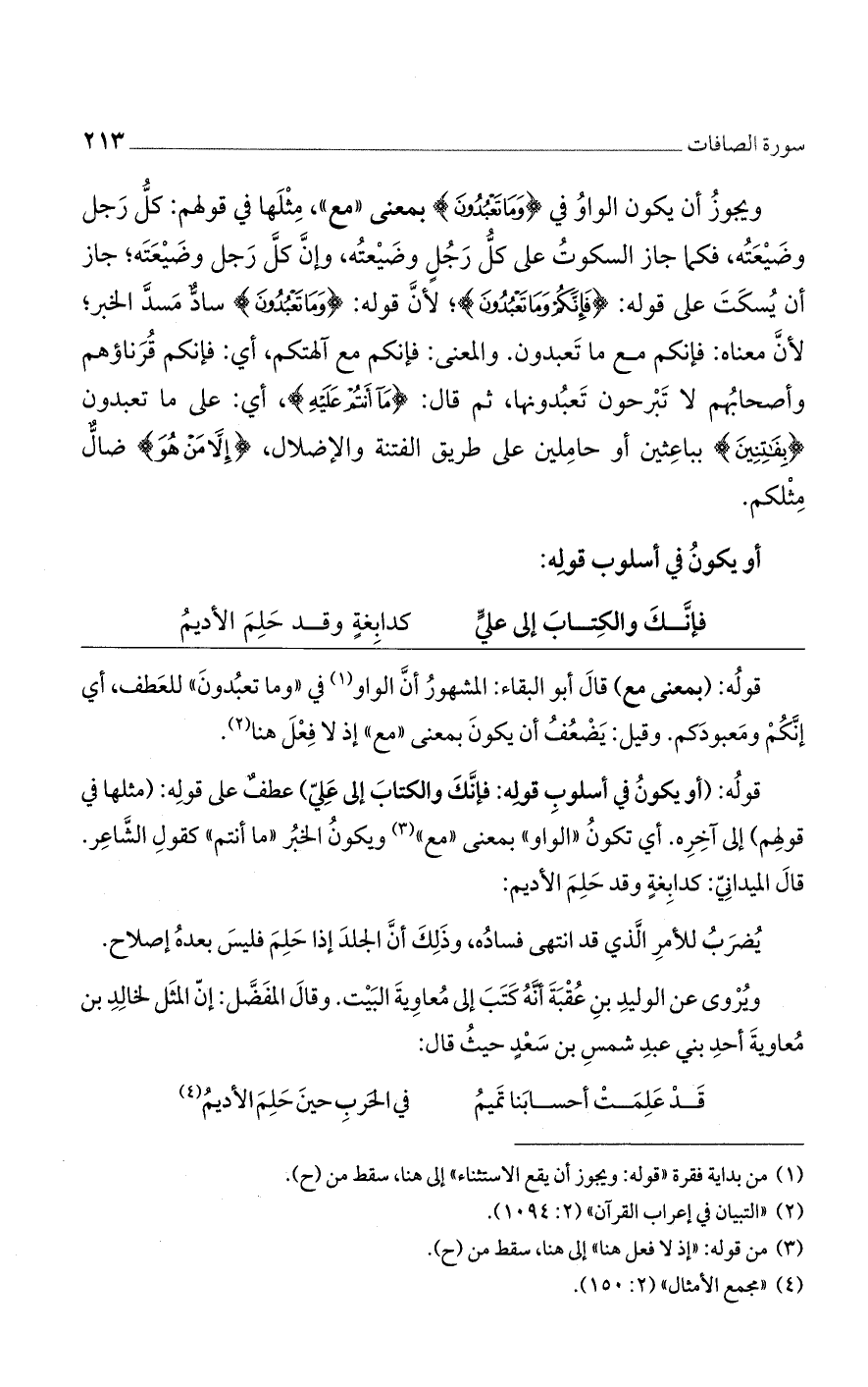 ويجوز أن يكون الواو في {وَمَا تَعْبُدُونَ} بمعنى "مع" مثلها في قولهم: كل رجل وضيعته، فكما جاز السكوت على كل رجل وضيعته؛ جاز أن يسكت على قوله: {فَإِنَّكُمْ وَمَا تَعْبُدُونَ}؛ لأن قوله: {وَمَا تَعْبُدُونَ} ساد مسد الخبر، لأن معناه: فإنكم مع ما تعبدون. والمعنى: فإنكم مع آلهتكم، أي: فإنكم قرناؤهم وأصحابهم لا تبرحون تعبدونها، ثم قال {مَا أَنْتُمْ عَلَيْهِ}، أي: على ما تعبدون {بِفَاتِنِينَ} بباعثين أو حاملين على طريق الفتنة والإضلاب، {إِلَّا مَنْ هُوَ} ضال مثلكم.