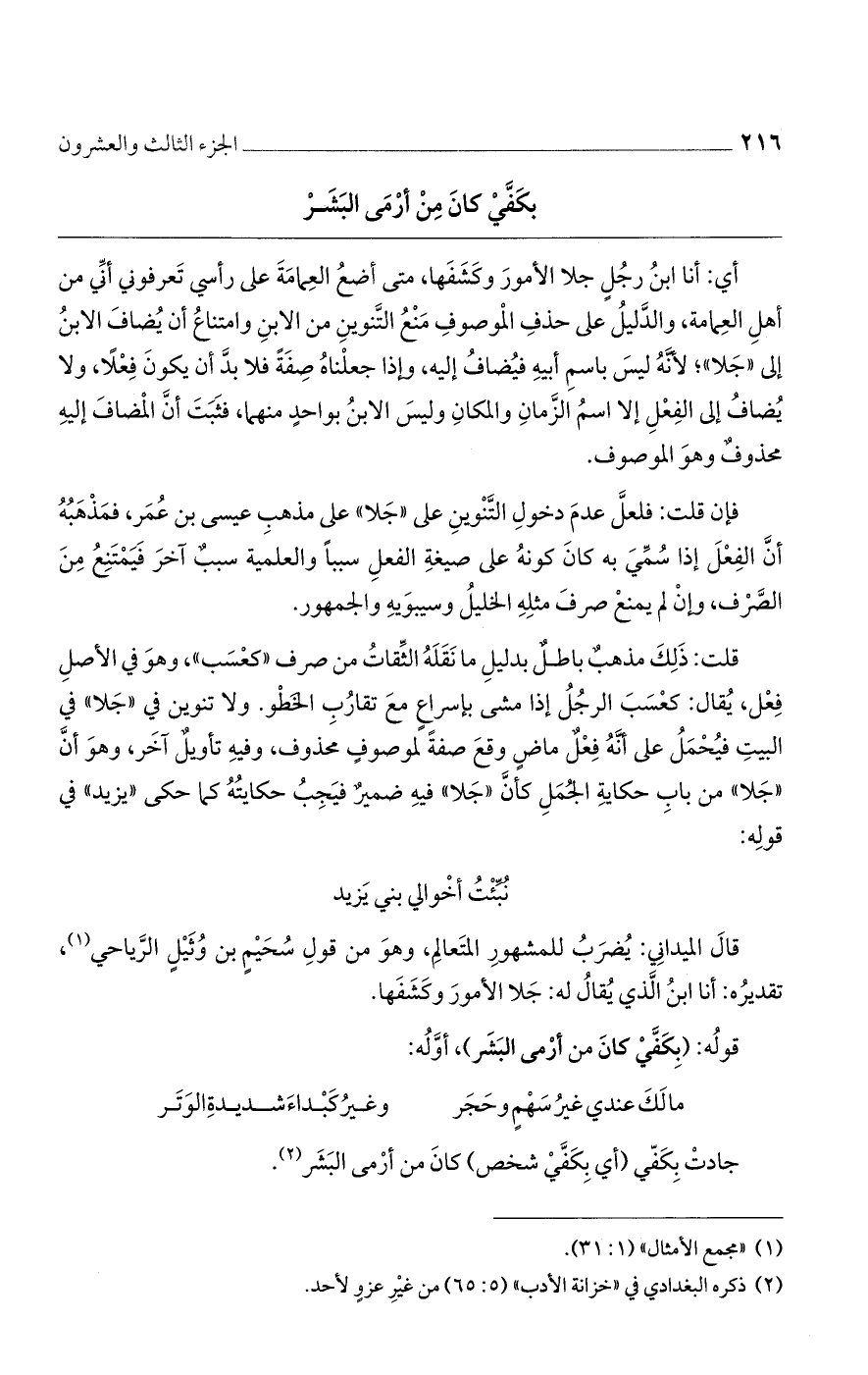 أي: أنا ابن رجل جلا الأمور وكشفها، متى أضع العمامة على رأسي تعرفوني أني من أهل العمامة، والدليل على حذف الموصوف منع التنوين من الابن وامتناع أن يضاف الابن إلى "جلا"؛ لأنه ليس باسم أبيه فيضاف إليه، وإذا جعلناه صفة فلا بد أن يكون فعلًا، ولا يضاف إلى الفعل إلا اسم الزمان والمكان وليس الابن بواحد منهما، فثبت أن المضاف إليه محذوف وهو الموصوف.