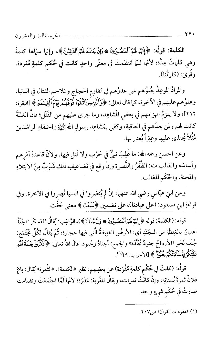 قوله: (الكلمة: قوله {إنَّهُمْ لَهُمُ المَنصُورُونَ * وإنَّ جُندَنَا})، الراغب: يقال للعسكر: الجند اعتبارًا بالغلظة من الجند أي: الأرض الغليظة التي فيها حجارة، ثم يقال لكل مجتمع: جند، نحو"الأرواح جنود مجندة" والجمع: أجناد وجنود. قال الله تعالى: {اذْكُرُوا نِعْمَةَ اللَّهِ عَلَيْكُمْ إِذْ جَاءَتْكُمْ جُنُودٌ} [الأحزاب: 9].
