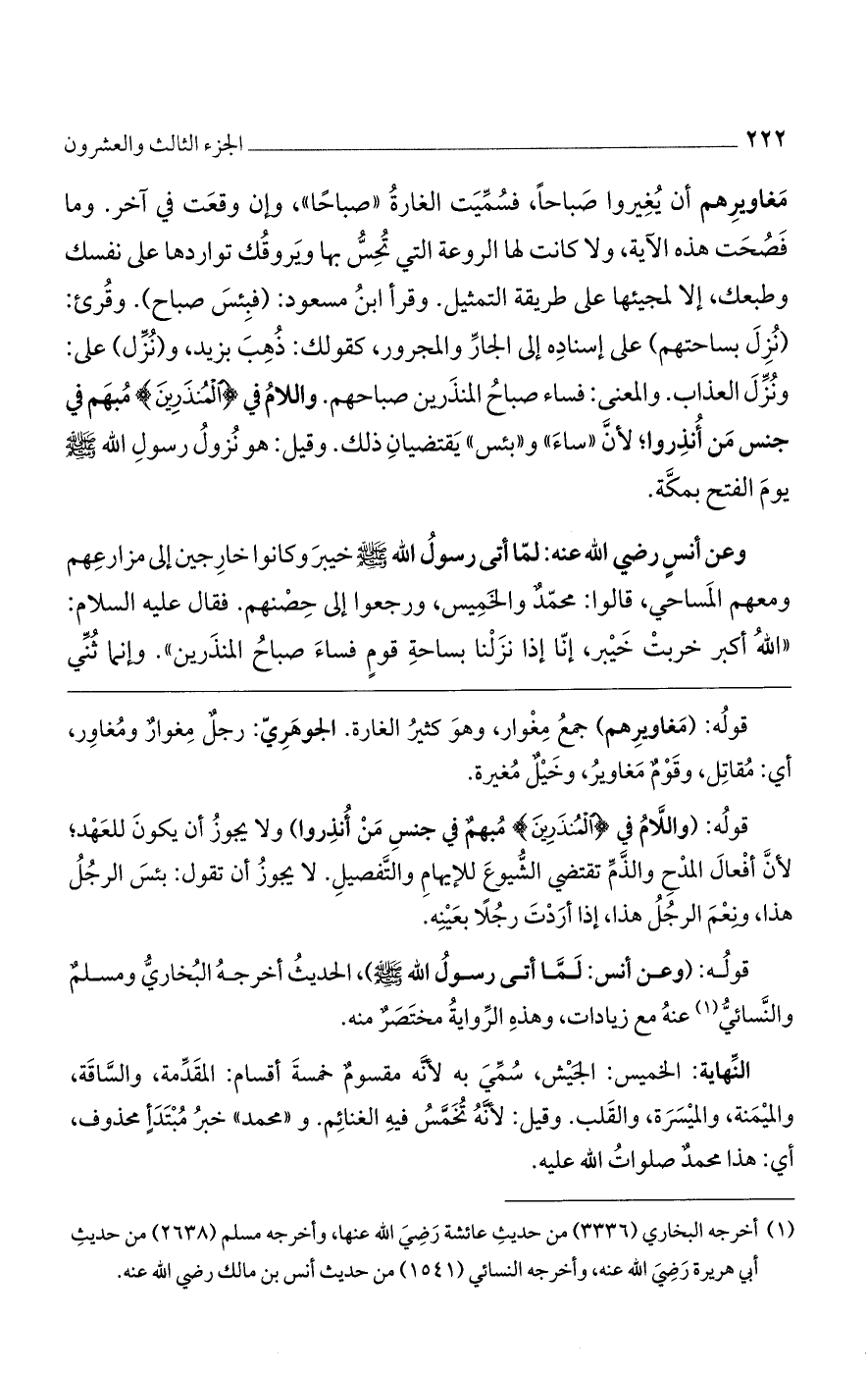 وعن أنس رضي الله عنه: لما أتى رسول الله صلى الله عليه وسلم خيبر وكانوا خارجين إلى مزارعهم ومعهم المساحي، قالوا: محمد والخميس، ورجعوا إلى حصنهم. فقال عليه السلام: "الله أكبر خربت خيبر، إنا إذا نزلنا بساحة قوم فساء صباح المنذرين". وإنما ثني