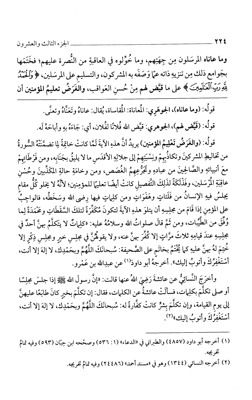 قوله: (والغرض تعليم المؤمنين) يريد أن هذه الآية لما كانت خاتمة لما تضمنته السورة من تخاليط المشركين وتكاذبهم ونسبتهم إلى جلاله الأقدس ما لا يليق بجنابه، ومن فرطاتهم مع أنبيائه والصالحين من عباده وتجرعهم الغصص، ومن وخامة حالة المكذبين وحسن عاقبة المرسلين، وفذلكة لذلك التفصيل كانت أيضًا تعليمًا للمؤمنين؛ لأنه لا يخلو كل مقام يجلس فيه الإنسان من فلتات وهفوات ومن كلمات فيها رضي الله وسخطه، فالواجب على المؤمن إذا قام من مجلسه أن يتلو هذه الآية لتكون مكفرة لتلك السقطات ومحمدةً لما وفق من الطيبات، ومن ثم قال صلوات الله وسلامه عليه: "كلمات لا يتكلم بهن أحد في مجلسه عند قيامه ثلاث مرات إلا كفر بهن عنه، ولا يقولهن في مجلس خير ومجلس ذكر إلا ختم له بهن عليه كما يختم بخاتم على الصحيفة: سبحانك اللهم وبحمدك، لا إله إلا أنت، أستغفرك وأتوب إليك". أخرجه أبو داود عن عبد الله بن عمرو.