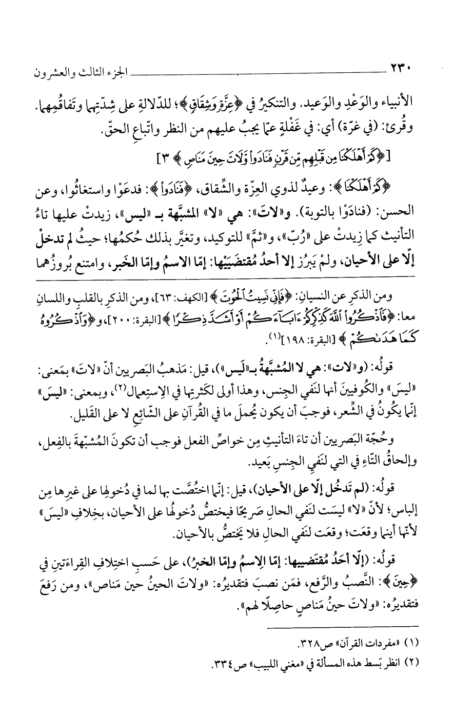 قوله: (و"لات": هي لا المشبهة بـ"ليس")، قيل: مذهب البصريين أن "لات" بمعنى: "ليس" والكوفيين أنها لنفي الجنس، وهذا أولى لكثرتها في الاستعمال، وبمعنى: "ليس" إنما يكون في الشعر، فوجب أن يكون يحمل ما في القرآن على الشائع لا على القليل.