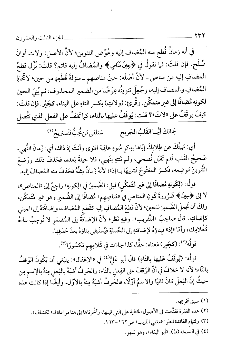 في أنه زمان قطع منه المضاف إليه وعوض التنوين؛ لأن الأصل: ولات أوان صلح. فإن قلت: فما تقول في {حِينَ مَنَاصٍ} والمضاف إليه قائم؟ قلت: نزل قطع المضاف إليه من مناص- لأن أصله: حين مناصهم- منزلة قطعه من حين؛ لاتخاذ المضاف والمضاف إليه، وجعل تنوينه عوضًا من الضمير المحذوف، ثم بني الحين لكونه مضافًا إلى غير متمكن. وقرئ: (ولات) بكسر التاء على البناء، كجير. فإن قلت: كيف يوقف عليها بالتاء، كما تقف على الفعل الذي تتصل