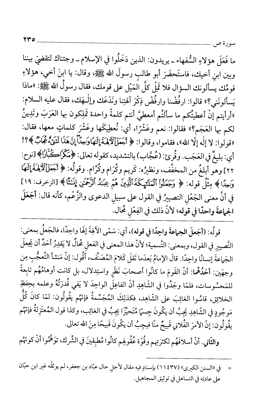قوله: (أجعل الجماعة واحدًا في قوله)، أي: سمى الآلهة إلها واحدًا، فالجعل بمعنى: التصيير في القول، وبمعنى: التسمية؛ لأن هذا المعنى في الفعل محال لا يقدر أحد أن يجعل الجماعة إنسانًا واحدًا. قال الإمام بعدما نقل كلام المصنف، أقول: إن منشأ التعجب من وجهين: أحدهما: أن القوم ما كانوا أصحاب نظر واستدلال، بل كانت أوهامهم تابعةً للمحسوسات، فلما وجدوا في الشاهد أن الفاعل الواحد لا يفي قدرته وعلمه بحفظ الخلائق، قاسوا الغائب على الشاهد، فكذلك المجسمة فإنهم يقولون: لما كان كل موجود في الشاهد يجب أن يكون جسمًا متحيزًا يجب في الغائب، وكذا قول المعتزلة فإنهم يقولون: إن الأمر الفلاني قبيح منا فيجب أن يكون قبيحًا من الله تعالى.