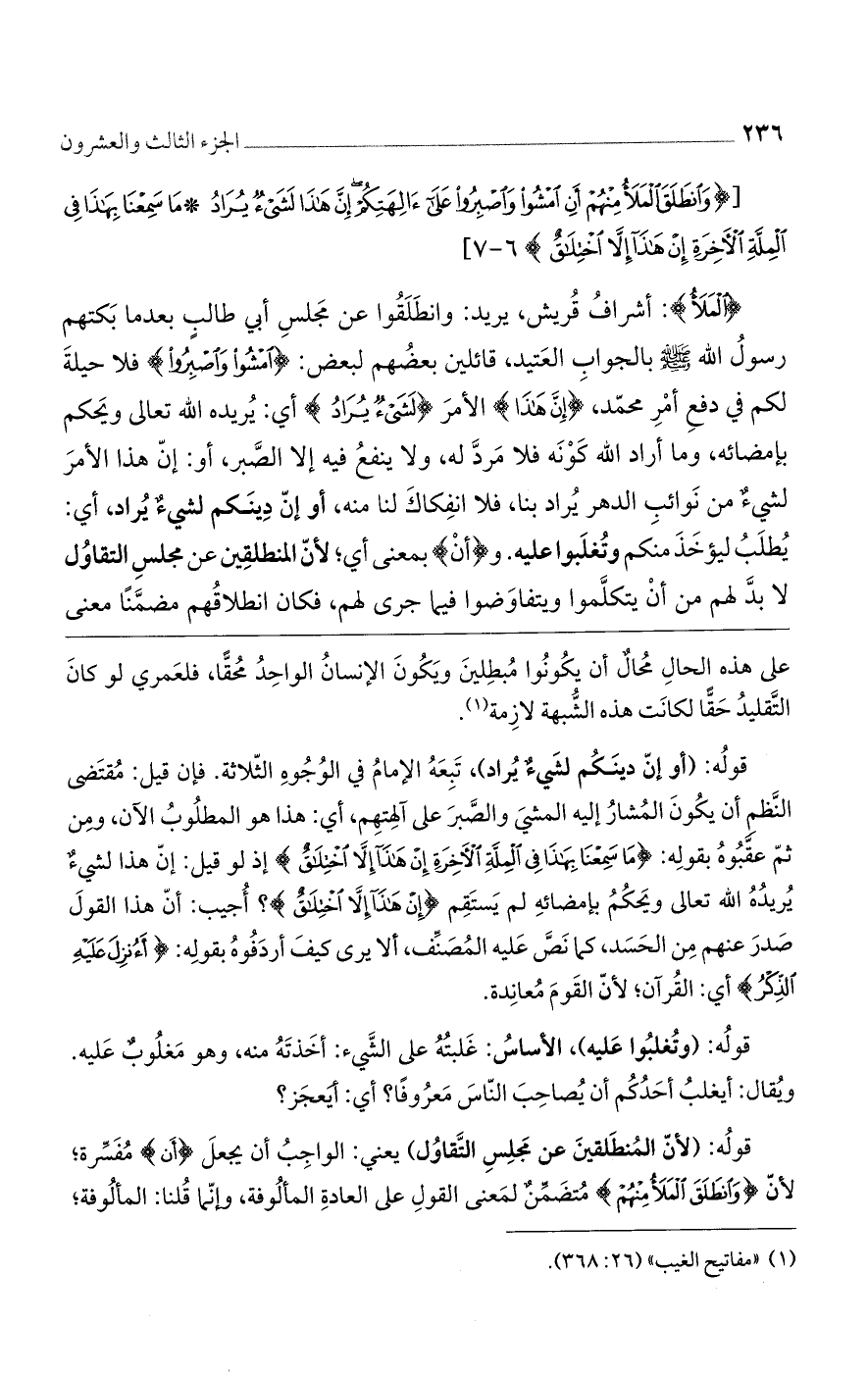 {الْمَلَأُ}: أشرف قريش، يريد: وانطلقوا عن مجلس أبي طالب بعدما بكتهم رسول الله صلى الله عليه وسلم بالجواب العتيد، قائلين بعضهم لبعض: {امْشُوا وَاصْبِرُوا} فلا حيلة لكم في دفع أمر محمد، {إِنَّ هَذَا} الأمر {لَشَيْءٌ يُرادُ} أي: يريده الله تعالى ويحكم بإمضائه، وما أراد الله كونه فلا مرد له، ولا ينفع فيه إلا الصبر، أو: إن هذا الأمر لشيء من نوائب الدهر يراد بنا، فلا انفكاك لنا منه، أو إن دينكم لشيء يراد، أي: يطلب ليؤخذ منكم وتغلبوا عليه. و {أَنْ} بمعنى أي: لأن المنطلقين عن مجلس التقاول لا بد لهم من أن يتكلموا ويتفاوضوا فيما جرى لهم، فكان انطلاقهم مضمنا معنى