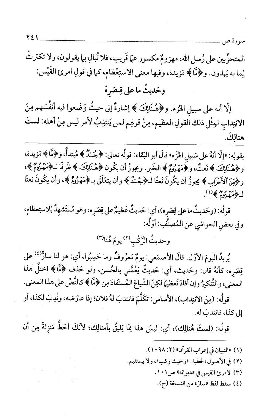 بقوله: "إلا أنه على سبيل الهزء" قال أبو البقاء: قوله تعالى: {جُندٌ} مبتدأ، و {مَّا} مزيدة، و {هُنَالِكَ} نعت، و {مَهْزُومٌ} الخبر. ويجوز أن يكون {هُنَالِكَ} ظرفًا لـ {مَهْزُومٌ}، و {مِنَ الْأَحْزَابِ} يجوز أن يكون نعتًا لـ {جُندٌ} وأن يتعلق بـ {مَهْزُومٌ}، وأن يكون نعتًا لـ {مَهْزُومٌ}.