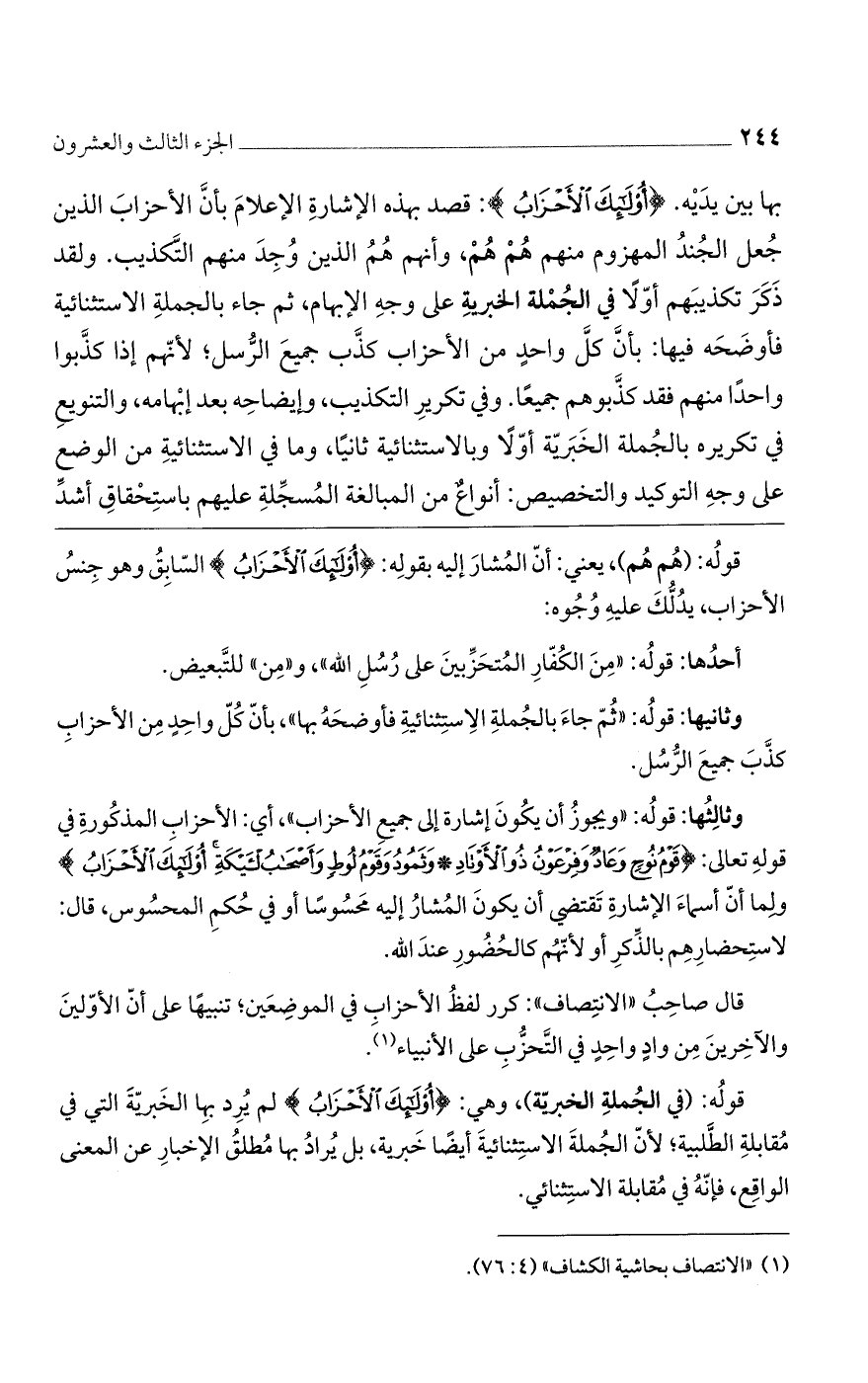 قوله: (في الجملة الخبرية)، وهي: {أُوْلَئِكَ الأَحْزَابُ} لم يرد بها الخبرية التي في مقابلة الطلبية؛ لأن الجملة الاستثنائية أيضًا خبرية، بل يراد بها مطلق الإخبار عن المعنى الواقع، فإنه في مقابلة الاستثنائي.