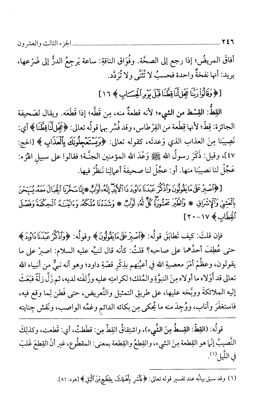 القط: القسط من الشيء؛ لأنه قطعة منه. من قطة؛ إذا قطعه. ويقال لصحيفة الجائزة: قط؛ لأنها قطعة من القرطاس، وقد فسر بهما قوله تعالى: {عَجِّل لَّنَا قِطَّنَا} أي: نصيبنا من العذاب الذي وعدته، كقوله تعالى: {وَيَسْتَعْجِلُونَكَ بِالْعَذَابِ} [الحج: 47]، وقيل: ذكر رسول الله صلى الله عليه وسلم وعد الله المؤمنين الجنة؛ فقالوا على سبيل الهزء: عجل لنا نصيبنا منها. أو: عجل لنا صحيفة أعمالنا ننظر فيها.