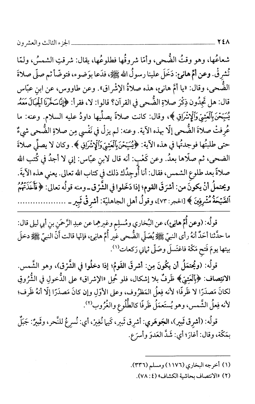 شعاعها، وهو وقت الضحى، وأما شروقها فطلوعها، يقال: شرقت الشمس، ولما تشرق. وعن أم هانئ: دخل علينا رسول الله صلى الله عليه وسلم، فدعا بوضوء، فتوضأ ثم صلى صلاة الضحى، فال: "يا أم هانئ، هذه صلاة الإشراق". وعن طاووس، عن ابن عباس قال: هل تجدون ذكر صلاة الضحى في القرآن؟ قالوا: لا، فقرأ: {إنَّا سَخَّرْنَا الجِبَالَ مَعَهُ يُسَبِّحْنَ بِالْعَشِيِّ والإشْرَاقِ}، وقال: كانت صلاةً يصليها داود عليه السلام. وعنه: ما عرفت صلاة الضحى إلا بهذه الآية: وعنه لم يزل في نفسي من صلاة الضحى شيء حتى طلبتها فوجدتها في هذه الآية: {يُسَبِّحْنَ بِالْعَشِيِّ والإشْرَاقِ}. وكان لا يصلي صلاة الضحى، ثم صلاها بعد. وعن كعب: أنه قال لابن عباس: إني لا أجد في كتب الله صلاة بعد طلوع الشمس، فقال: أنا أوجدك ذلك في كتاب الله تعالى. يعني هذه الآية.