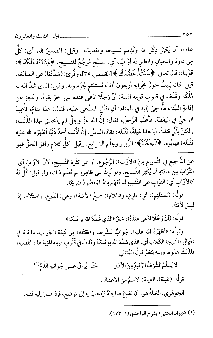 عادته أن يكثر ذكر الله ويديم تسبيحه وتقديسه. وقيل: الضمير لله، أي: كل من داود والجبال والطير لله أواب، أي: مسبح مرجع للتسبيح. {وشَدَدْنَا مُلْكَهُ}: قويناه، قال تعالى: {سَنَشُدُّ عَضُدَكَ} [القصص: 35]، وقرئ: (شددنا) على المبالغة. قيل: كان يبيت حول محرابه أربعون ألف مستلئم يحرسونه. وقيل: الذي شد الله به ملكه وقذف في قلوب قومه الهيبة: أن رجلًا ادعى عنده على آخر بقرةً، وعجز عن إقامة البينة، فأوحي إليه في المنام: أن اقتل المدعى عليه، فقال: هذا منام، فأعيد الوحي في اليقظة، فأعلم الرجل، فقال: إن الله عز وجل لم يأخذني بهذا الذنب، ولكن بأني قتلت أبا هذا غيلةً، فقتله، فقال الناس: إن أذنب أحد ذنبًا أظهره الله عليه فقتله؛ فهابوه. {الْحِكْمَةَ}: الزبور وعلم الشرائع. وقيل: كل كلام وافق الحق فهو