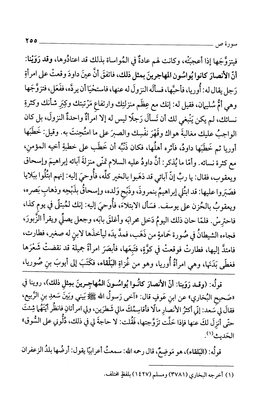 فيتزوجها إذا أعجبته، وكانت لهم عادة في المواساة بذلك قد اعتادوها، وقد روينا: أن الأنصار كانوا يواسون المهاجرين بمثل ذلك، فاتفق أن عين داود وقعت على امرأة رجل يقال له: أوريا، فأحبها، فسأله النزول له عنها، فاستحيا أن يرده، ففعل، فتزوجها وهي أم سليمان، فقيل له: إنك مع عظم منزلتك وارتفاع مرتبتك وكبر شأنك وكثرة نسائك، لم يكن ينبغي لك أن تسأل رجلًا ليس له إلا امرأة واحدة النزول، بل كان الواجب عليك مغالبة هواك وقهر نفسك والصبر على ما امتحنت به. وقيل: خطبها أوريا ثم خطبها داود، فآثره أهلها، فكان ذنبه أن حطب على خطبة أخيه المؤمن، مع كثرة نسائه. وأما ما يذكر، أن داود عليه السلام تمنى منزلة آبائه إبراهيم وإسحاق ويعقوب، فقال: يا رب إن آبائي قد ذهبوا بالخير كله، فأوحي إليه: إنهم ابتلوا ببلايا فصبروا عليها: قد ابتلي إبراهيم بنمروذ، وذبح ولده، وإسحاق بذبحه وذهاب بصره، ويعقوب بالحزن على يوسف. فسأل الابتلاء، فأوحي إليه: إنك لمبتلى في يوم كذا، فاحترس. فلما حان ذلك اليوم دخل محرابه وأغلق بابه، وجعل يصلي ويقرأ الزبور، فجاءه الشيطان في صورة حمامة من ذهب، فمد يده ليأخذها لابن له صغير، فطارت، فامتد إليها، فطارت فوقعت في كوة، فتبعها، فأبصر امرأة جميلة قد نقضت شعرها فغطى بدنها، وهي امرأة أوريا، وهو من غزاة البلقاء، فكتب إلى أيوب بن صوريا،