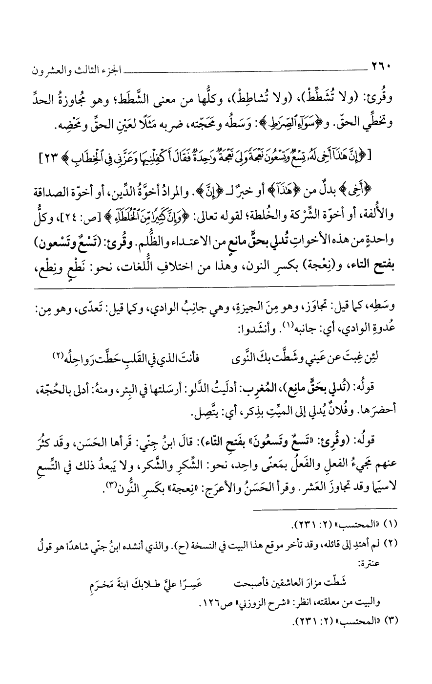 [{إنَّ هَذَا أَخِي لَهُ تِسْعٌ وتِسْعُونَ نَعْجَةً ولِيَ نَعْجَةٌ واحِدَةٌ فَقَالَ أَكْفِلْنِيهَا وعَزَّنِي فِي الخِطَابِ} 23] {أَخِي} بدل من {هَذَا} أو خبر لـ {إِنَّ}. والمراد أخوة الدين، أو أخوة الصداقة والألفة، أو أخوة الشركة والخلطة؛ لقوله تعالى: {وإنَّ كَثِيرًا مِنَ الخُلَطَاءِ} [ص: 24]، وكل واحدة من هذه الأخوات تدلي بحق مانع من الاعتداء والظلم. وقرئ: (تسع وتسعون) بفتح التاء، و (نعجة) بكسر النون، وهذا اختلاف اللغات، نحو: نطع ونطع،