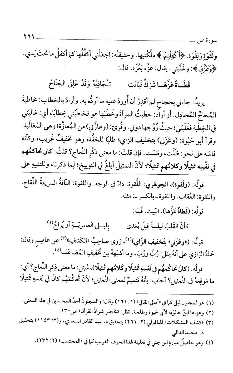 قوله: ("وعزني" بتخفيف الزاي)، روى صاحب "الكشف" عن عاصم وقال: حمله الرازي على أنه مثل: رب ورب، وما أشبهه من تخفيف المضاعف.