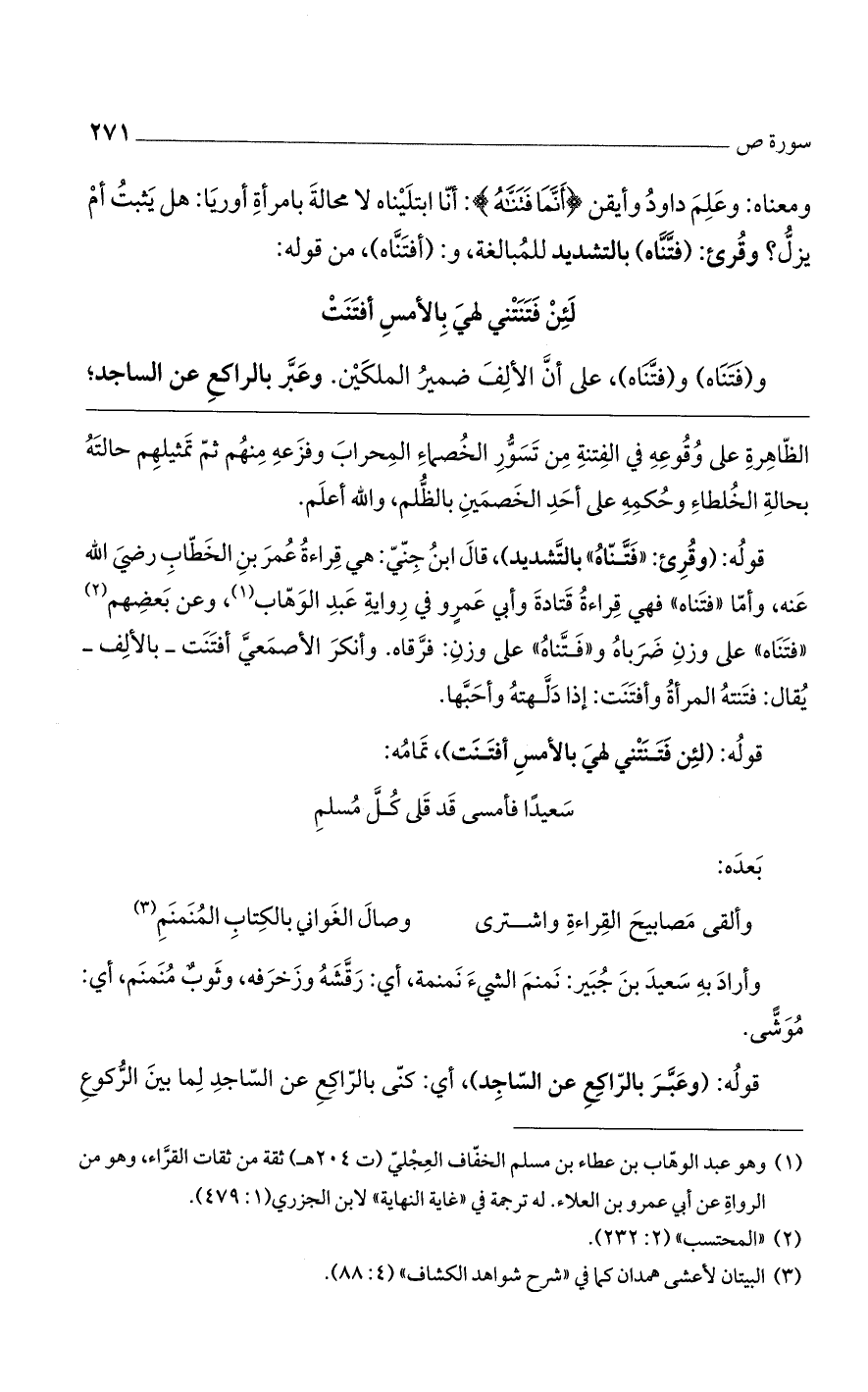 ومعناه: وعلم داود وأيقن {أَنَّمَا فَتَنَّاهُ}: أنا ابتليناه لا محالة بامرأة أوريا: هل يثبت أم يزل؟ وقرئ: (فتناه) بالتشديد للمبالغة، و: (أفتناه)، من قوله: